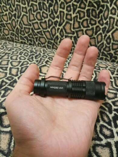 заказал 22.01. прибыло 9.02 кроха - поперёк ладони (даже с моей не самой большой рукой) помещается. линза светодиода с небольшими загрязнениями, на работу не влияет линза фонаря - более-менее. Видимого спектра очень много, можно использовать как обыкновенный фонарик )) тем не менее!!! заявленный 365 нм присутствует, что видно на купюре фото 2 (специально для проверки пришлось искать такую) - всё, что должно проявляться в указанной длине волн, проявляется. возможно, докуплю стекло Вуда, чтоб снизить видимый спектр. теперь недостатки: корпус - пластик. водонепроницаемость лучше не проверять, честно вам говорю. брызги, лёгкий дождь минуты 2-3 ещё выдержит, но корпус в подвижной части головы вряд ли герметичен, да и линза без уплотнителей. греется как батарея. пластик тепло не отводит совсем. чтоб кристалл светодиода не деградировал через неделю, лучше включать не более, чем на минуту, две - максимум... тем не менее!!! нужный спектр имеется. товаром доволен. продавцу - спасибо.