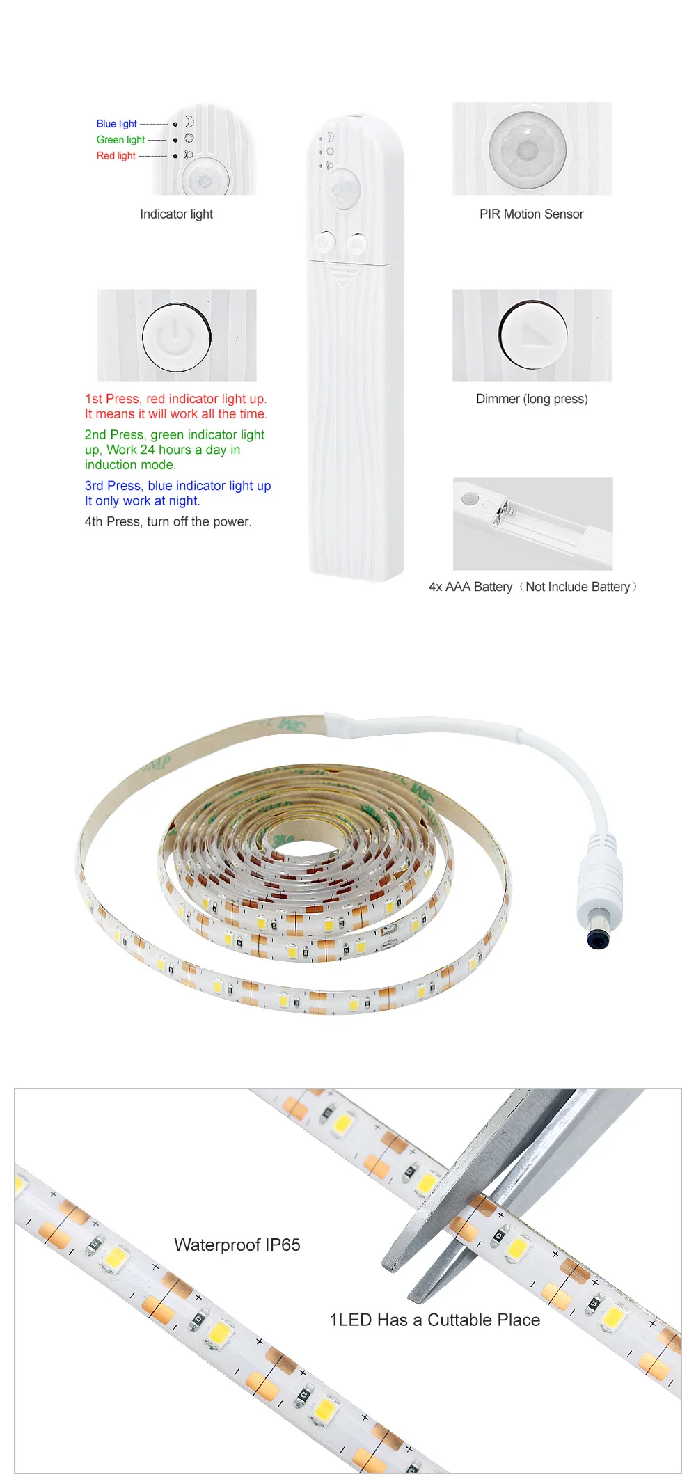 Работает нормально, нужны 4 батарейки aaa. Теплый белый выглядит как холодный белый, на этикетке написан теплый, но точно по сравнению с другими светодиодами, которые у меня есть, выглядит как холодный белый.