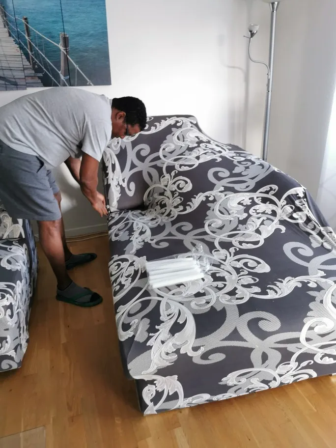 Very fast delivery. Трудно надеть, и есть части, которые плохо вписываются в диван в форму L, потому что они соединены. Но правда в том, что мне нравится жанр, и конечный результат неплохой, его можно улучшить.