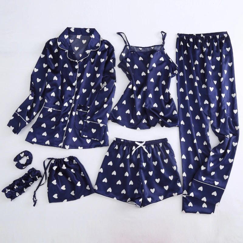 Пижамный комплект женский из 7 предметов, элегантный Шелковый Топ с длинным рукавом и шорты с принтом, штаны с эластичным поясом, одежда для сна, весна-осень