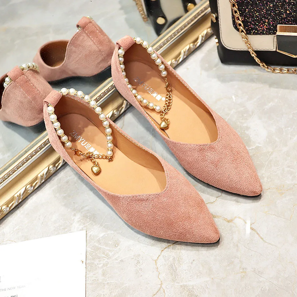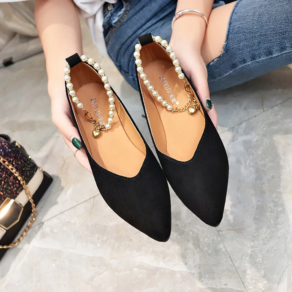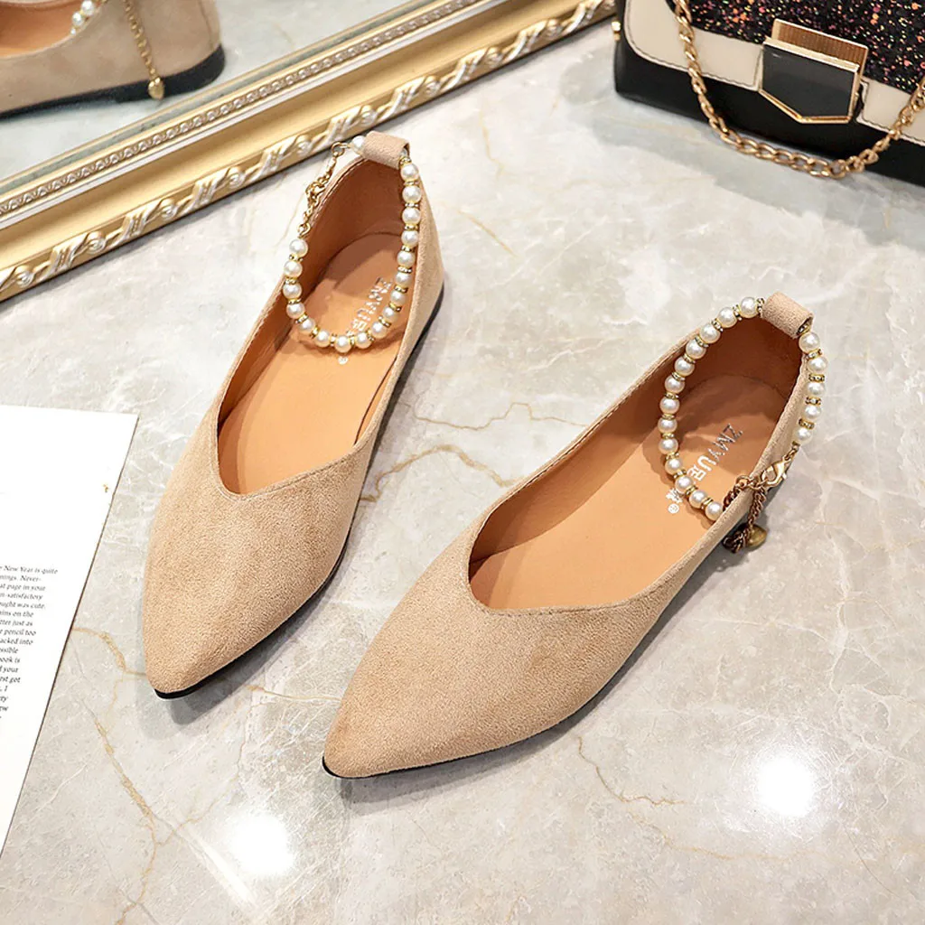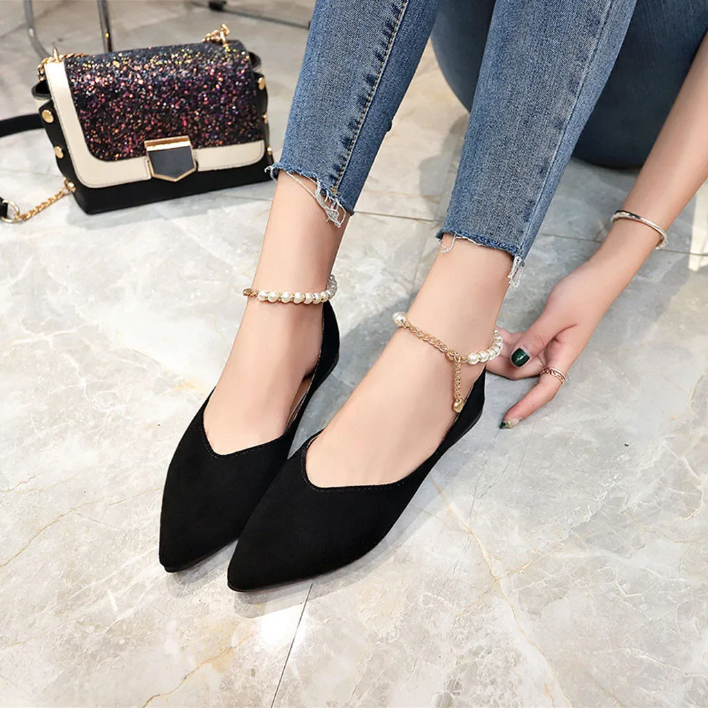 Туфли женские однотонные с острым носком, заостренный носок, плоская подошва, жемчуг, застежка-бусина, модные лоферы, весна-лето