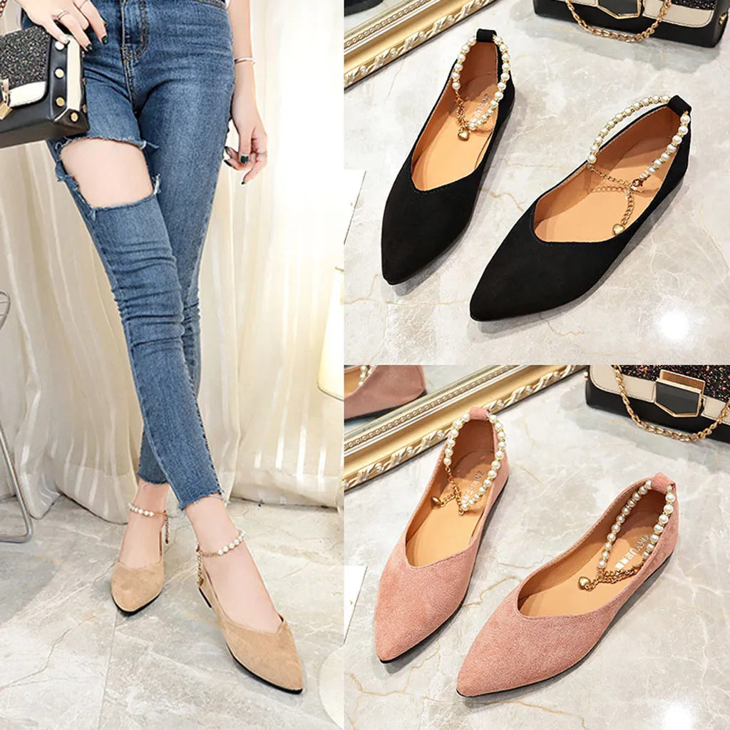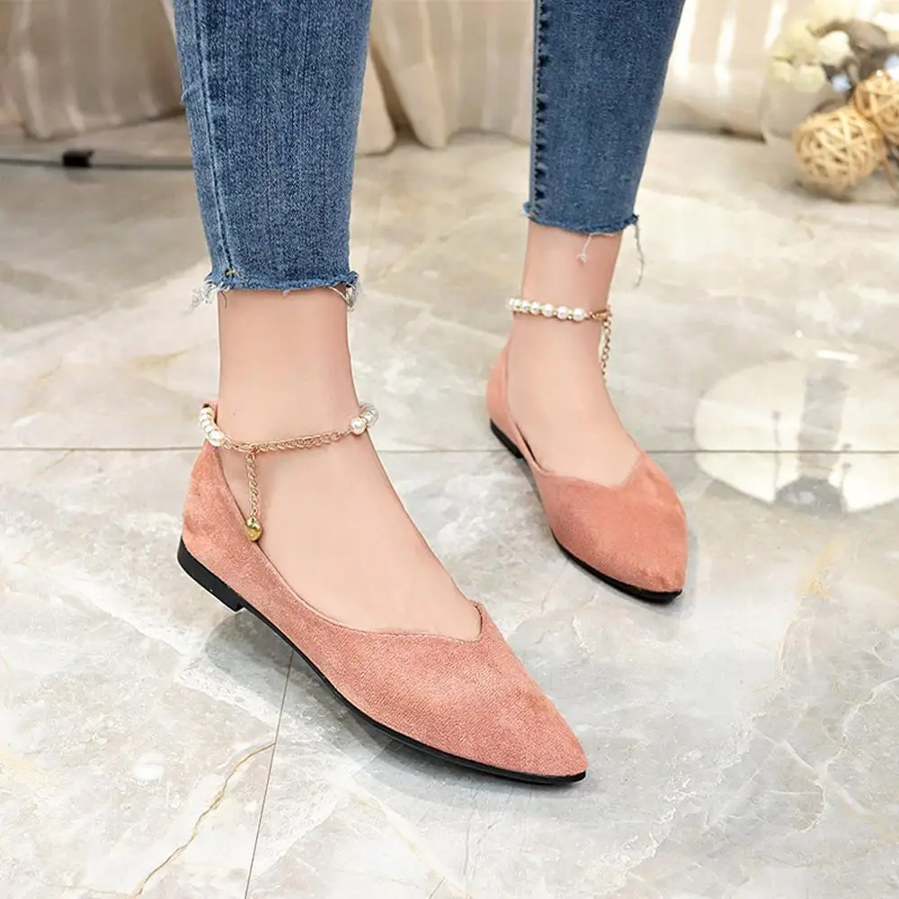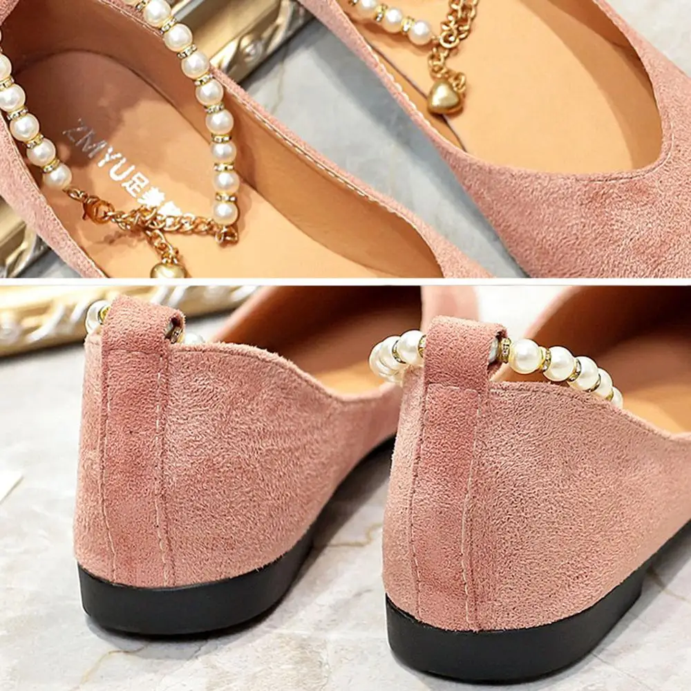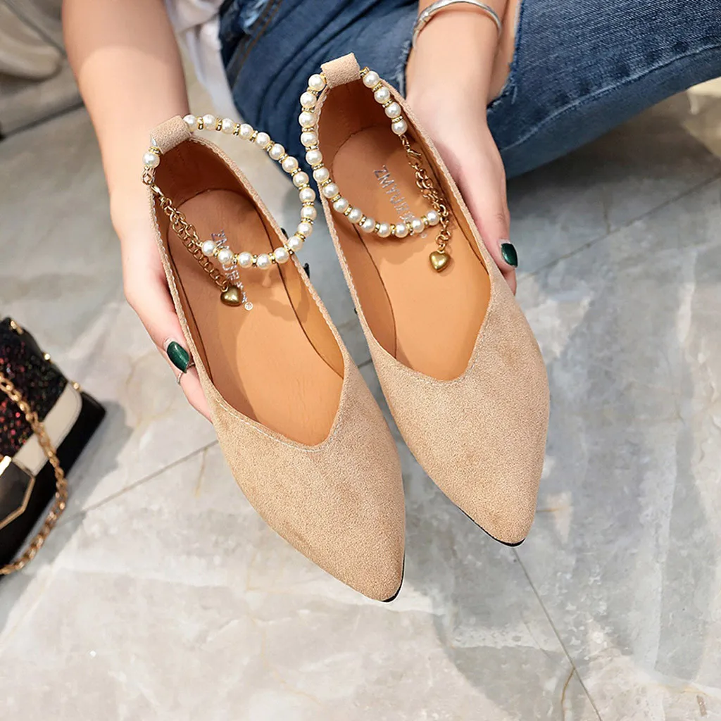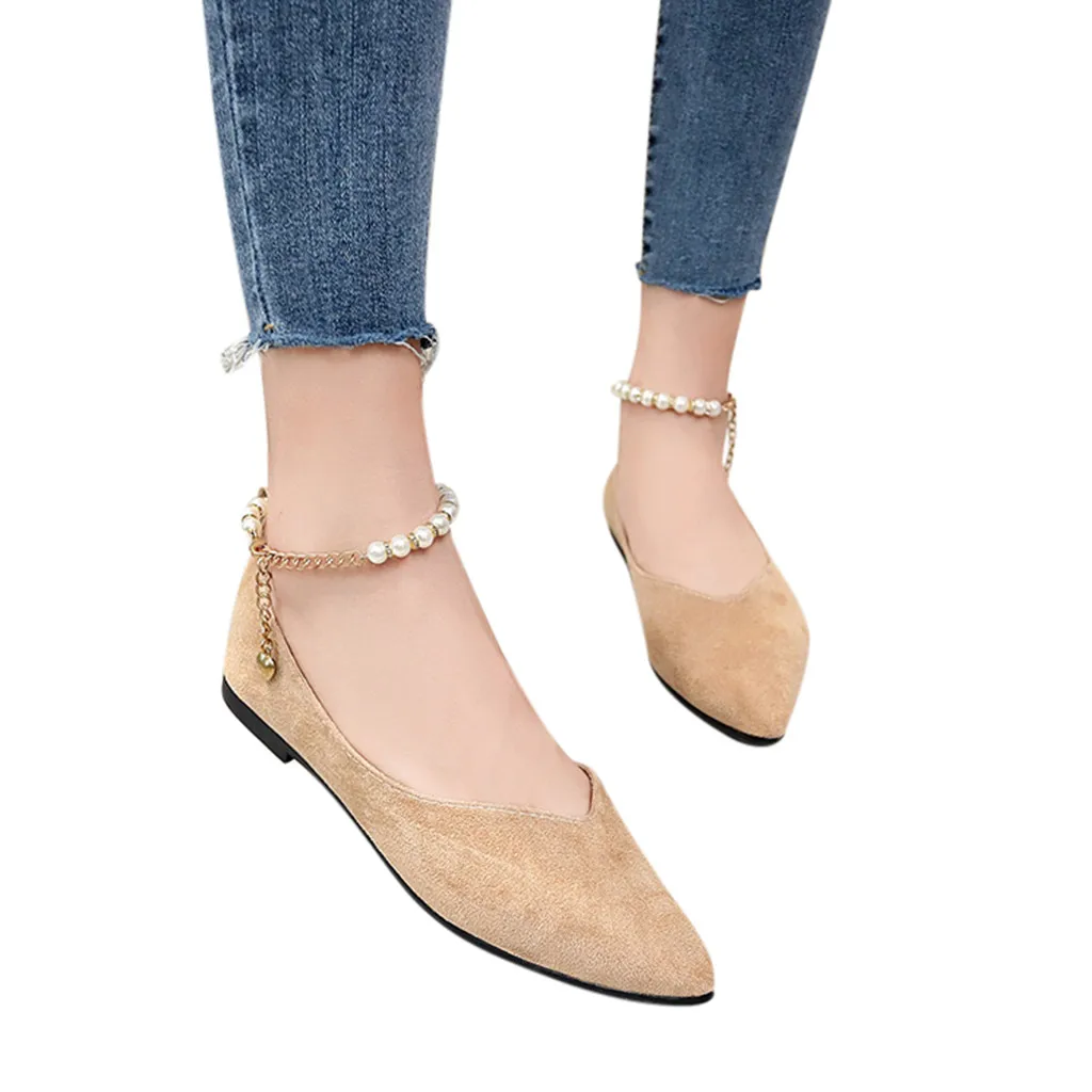 Туфли женские однотонные с острым носком, заостренный носок, плоская подошва, жемчуг, застежка-бусина, модные лоферы, весна-лето