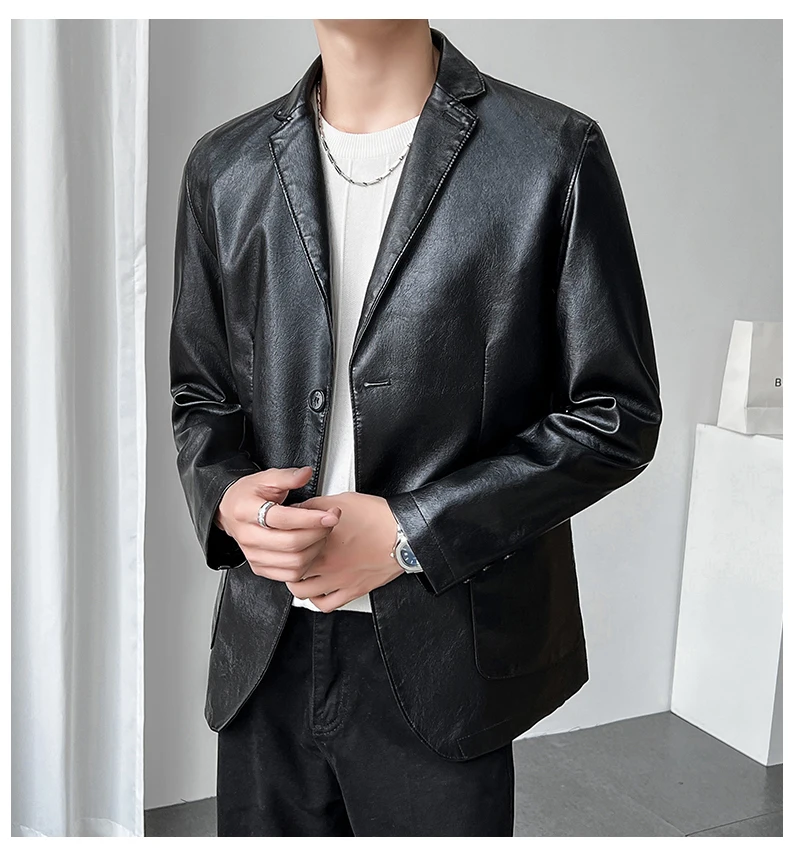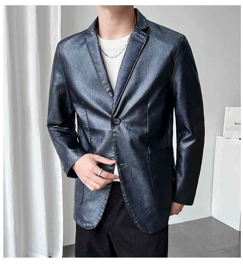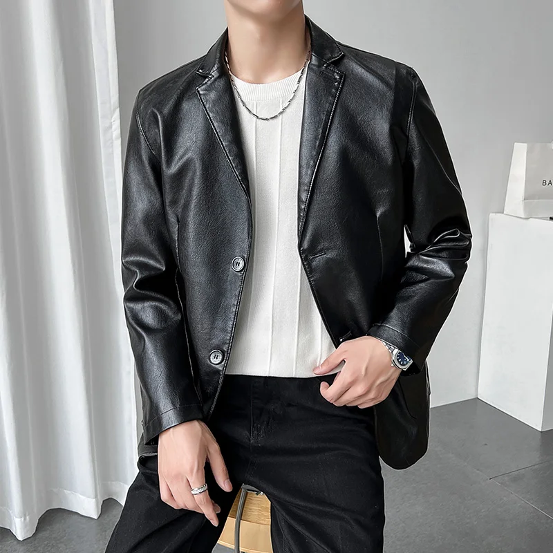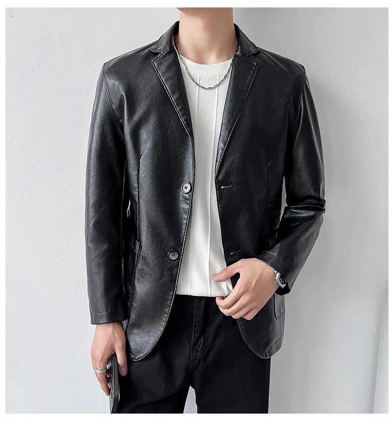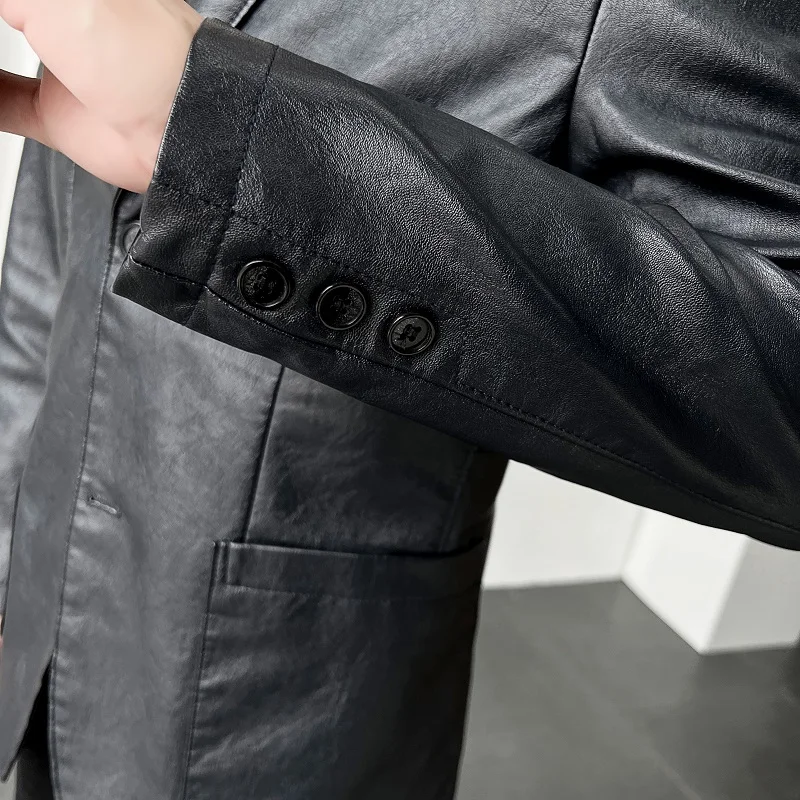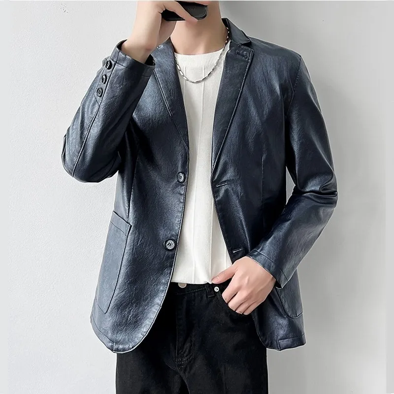Роскошный мужской черный блейзер из искусственной кожи Повседневный однотонный приталенный костюм куртка пальто с двумя пуговицами в Корейском стиле Красивая мужская одежда