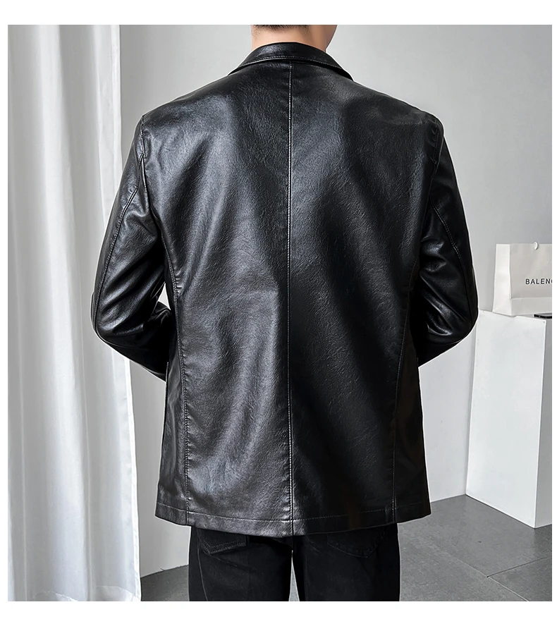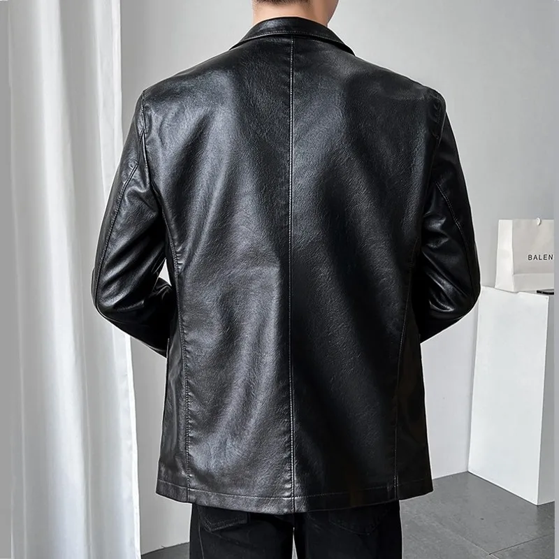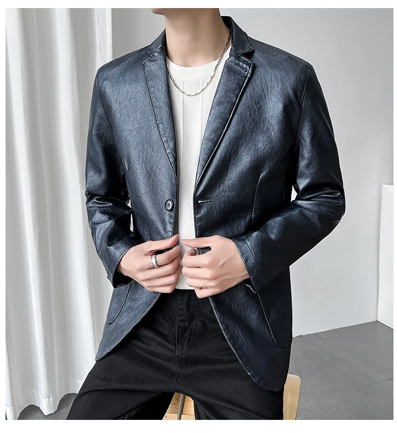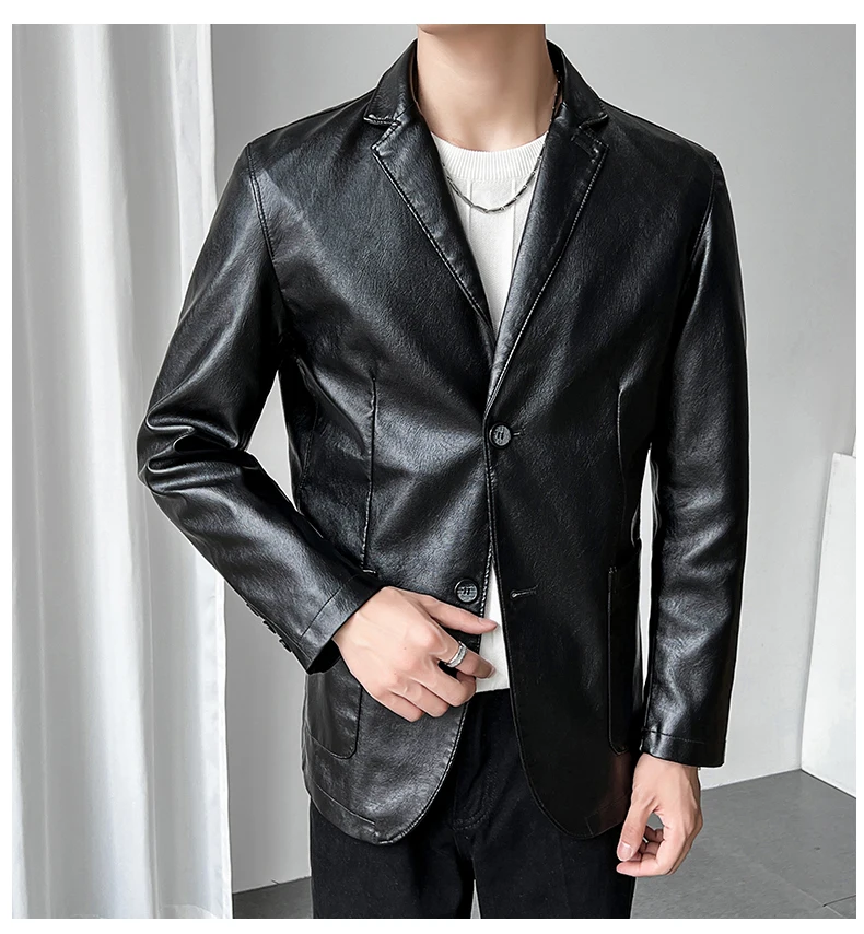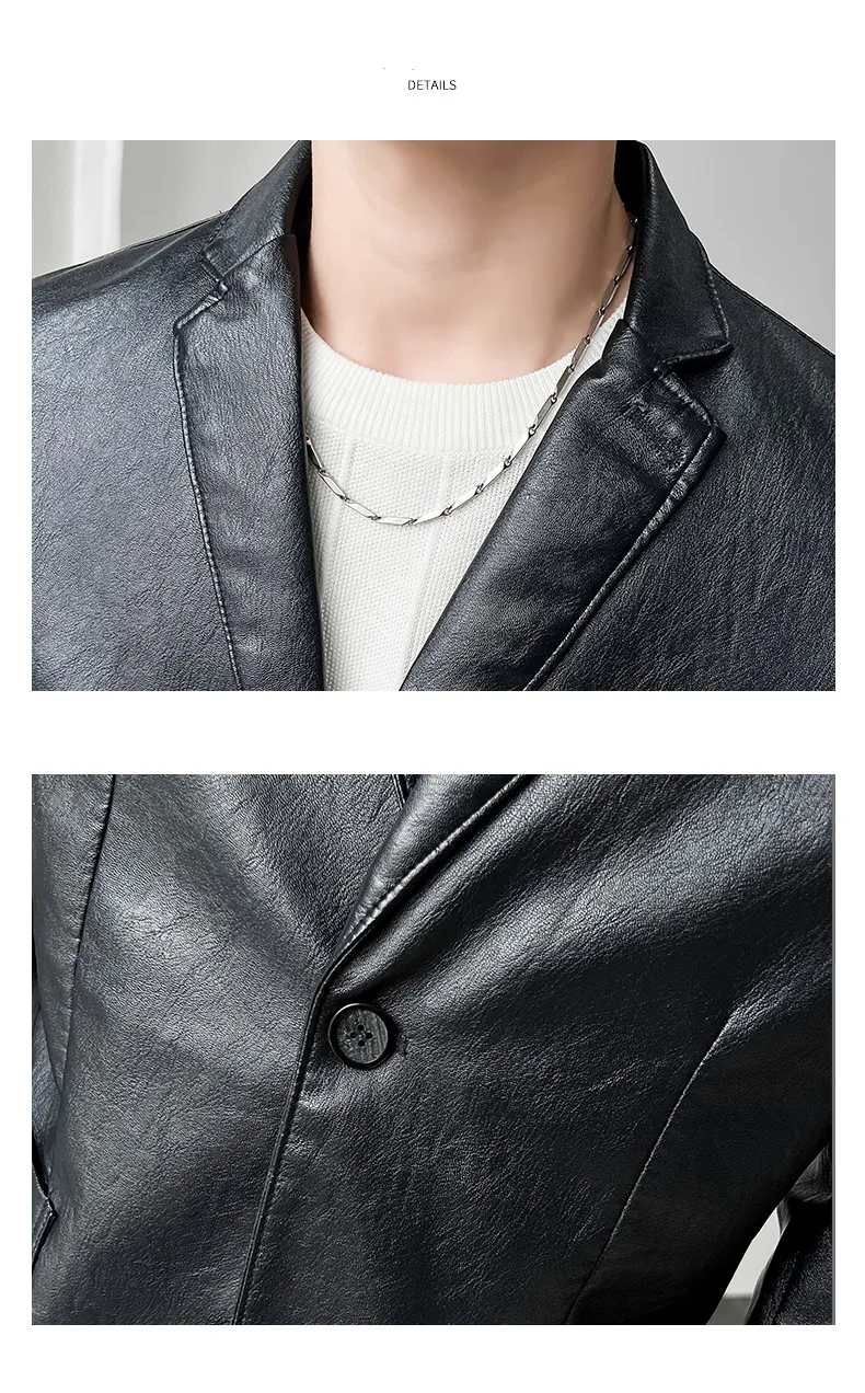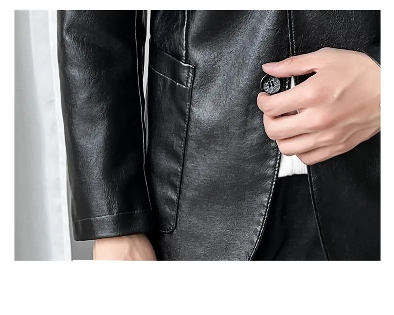Роскошный мужской черный блейзер из искусственной кожи Повседневный однотонный приталенный костюм куртка пальто с двумя пуговицами в Корейском стиле Красивая мужская одежда