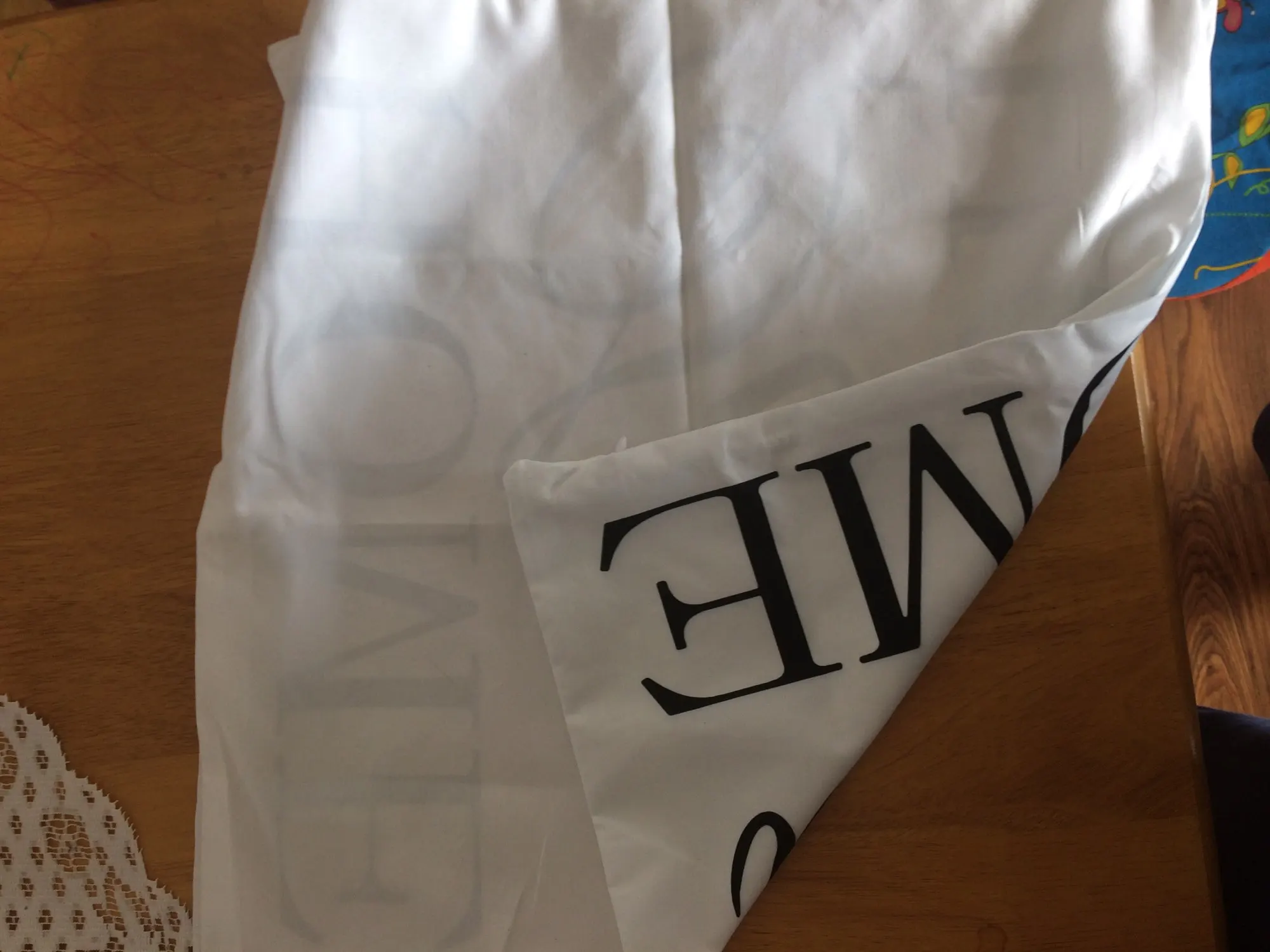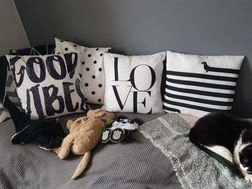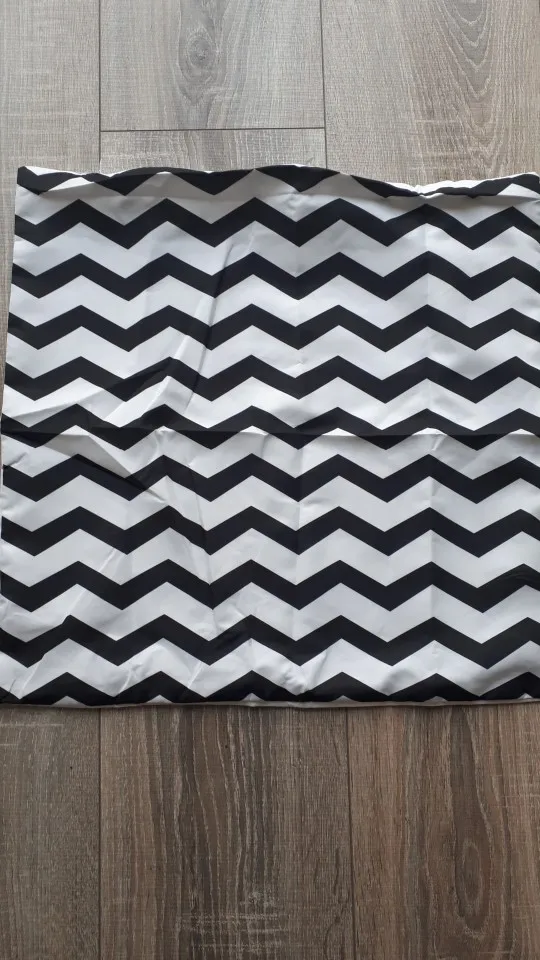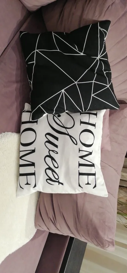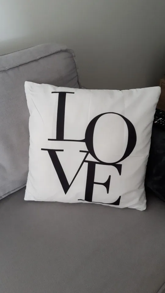 Доволен этой покупкой. Мне было трудно найти крышку для моего подушки 40 х40, та, которая составляет 43 х43, немного больше, но она проходит (см. Фото). Доставка заняла 20 дней для Франции. Ткань полиэстер, поэтому довольно блестящая, надписи соответствуют описанию.