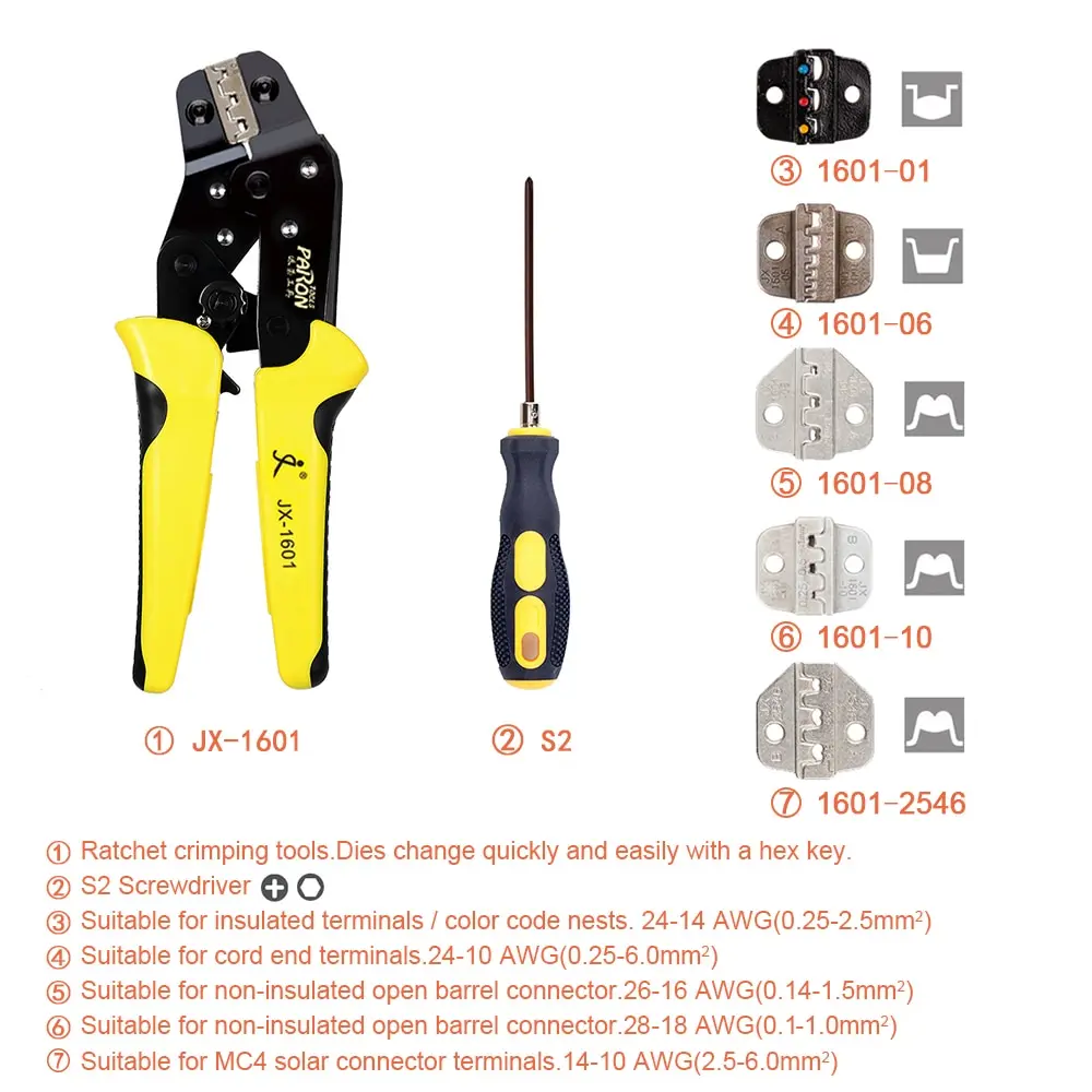 Характеристики:Название бренда: PARONМодель: JX-DS5Материал: Высокоуглеродистая сталь + сплавЦвет: желтый + черныйПодходящие клеммы и Диапазон обжима проводов:JX 1601-01: Цвет код гнезда + изолированные клеммы 24-14 AWG (0,25-2,5 мм ⊃ 2)JX 1601-06: конец шнура терминалы 24-10 AWG (0,25-6,0 мм ⊃ 2)JX 1601-08: неизолированные открытые баррель разъем 26-16 AWG (0,14-1,5 мм ⊃ 2)JX 1601-10: неизолированный открытый цилиндрический соединитель 28-18 AWG (0,1-1,0 мм соединитель 2;)JX 1601-2546: MC4 солнечной разъем клеммы 14-10 AWG (2,5-6,0 мм ⊃ 2)Размер проволоки: прибл. 190*80*20 мм/7,48*3,15 * 0.79inВес щипцы для проволоки: прибл. 348,5 г/12,29 унцийРазмер посылка: прибл. 23,5*18,5*4,5 см/9,25*7,28 * 1.77inВес посылка: прибл. 705 г/24,87 унцийПосылка: