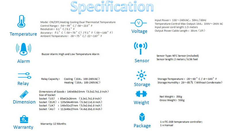 (1) режим контроля температуры:Управление ВКЛ/ВЫКЛ. Обратите внимание, что это только нагревательный контроллер без функции охлаждения. Обе вилки могут управлять нагревом. Но не более 1200 Вт.