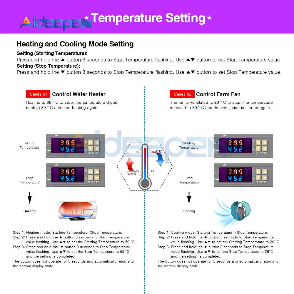 Шаг 3: удерживайте кнопку ▼ в течение 3 секунд, чтобы остановить мигание значения температуры. Используйте ▲▼, чтобы установить температуру остановки до 65 °C, и установка завершена.