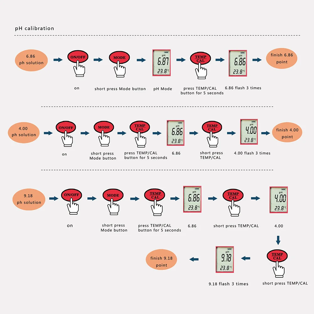 Показания ph нет возможности откалибровать. Во время спора продавец обманул меня. Отвечал мне на английском языке. В итоге спор был закрыт. Средства мне не кто не вернул. В общем прибор пришёл бракованым. Не советую этого продавца.