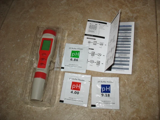 Прибор пришел. Батарейки в комплекте и калибровочные pH порошки - это плюс. К сожалению, tds откалибровать нечем, а он врет безбожно. При 130ppm показывает 150, при 7750 - просто зашкаливает. В целом работает. Осталось добыть калибровочные растворы для tds.