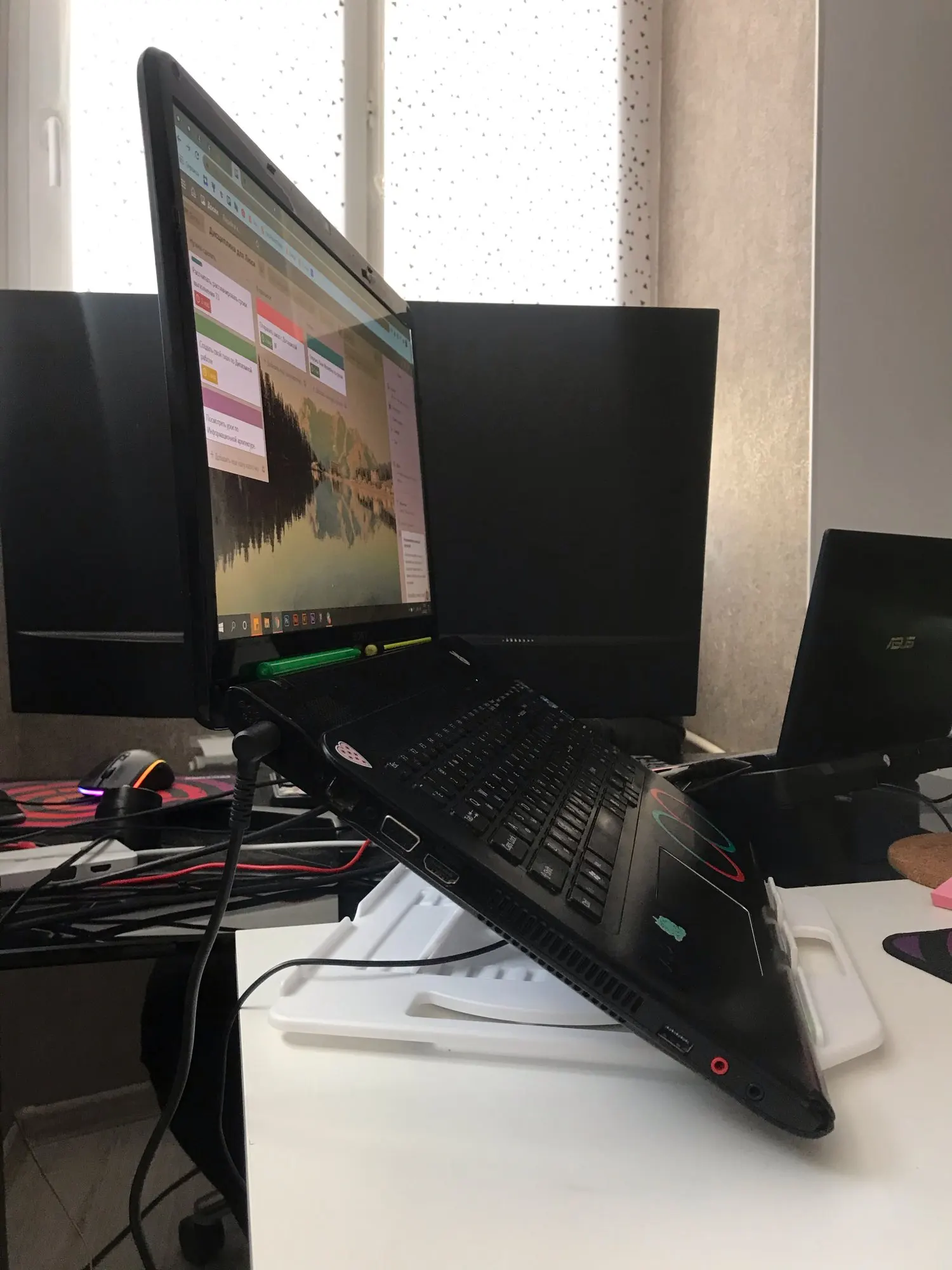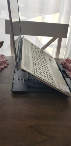 Очень хорошая подставка. Единственный минус - ноутбук трясётся, когда печатаешь на клавиатуре, а в остальном прекрасно! Стоит высоко, и даже ещё выше можно поставить, чем я привыкла. Стоит уверенно. Поворачивается. Подставка прорезинена, не елозит по столу. Я очень довольна. Доставка не шибко быстрая в Оренбург, месяц, не меньше. Закала бы ещё при необходимости, но пока не требуется