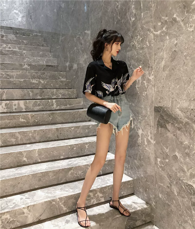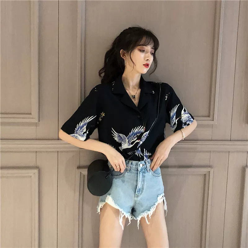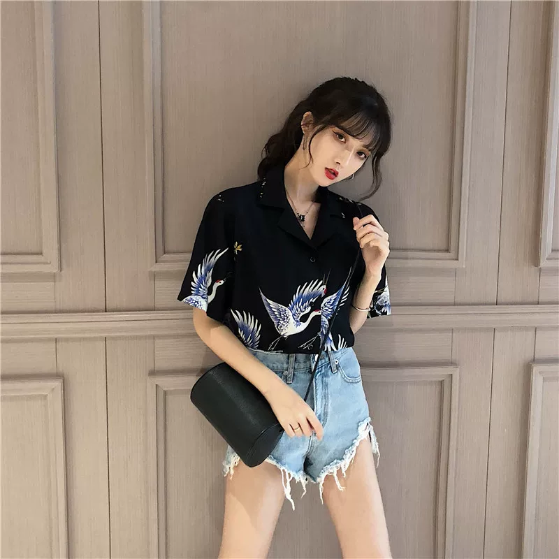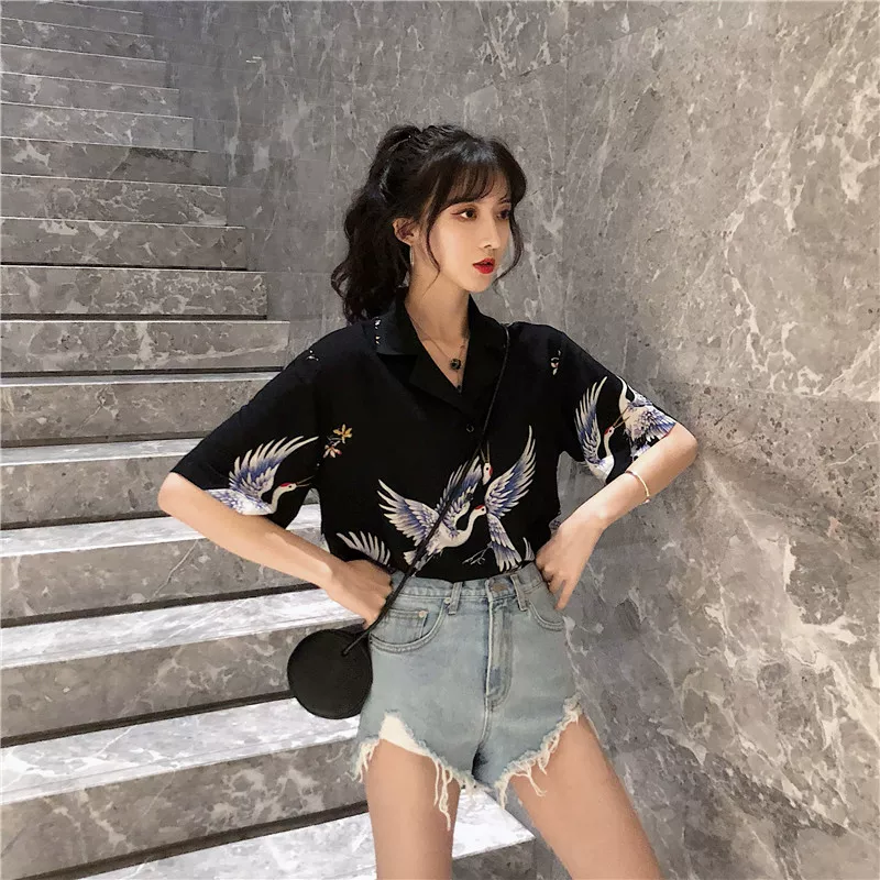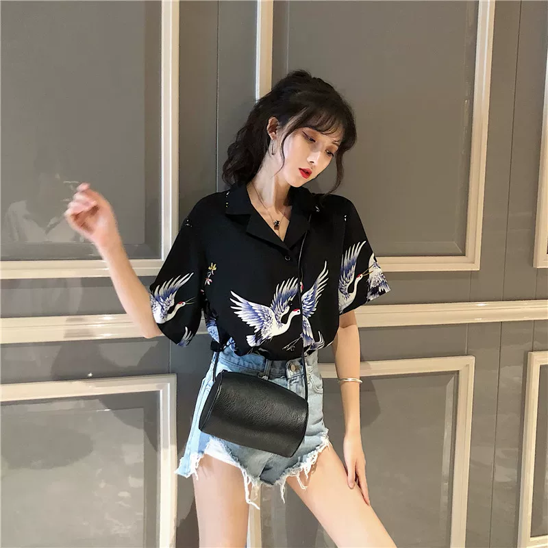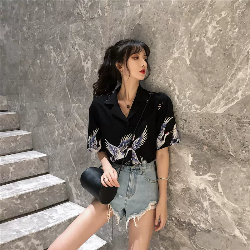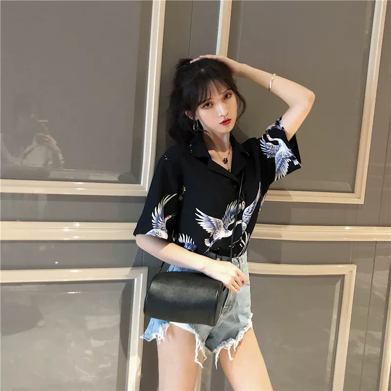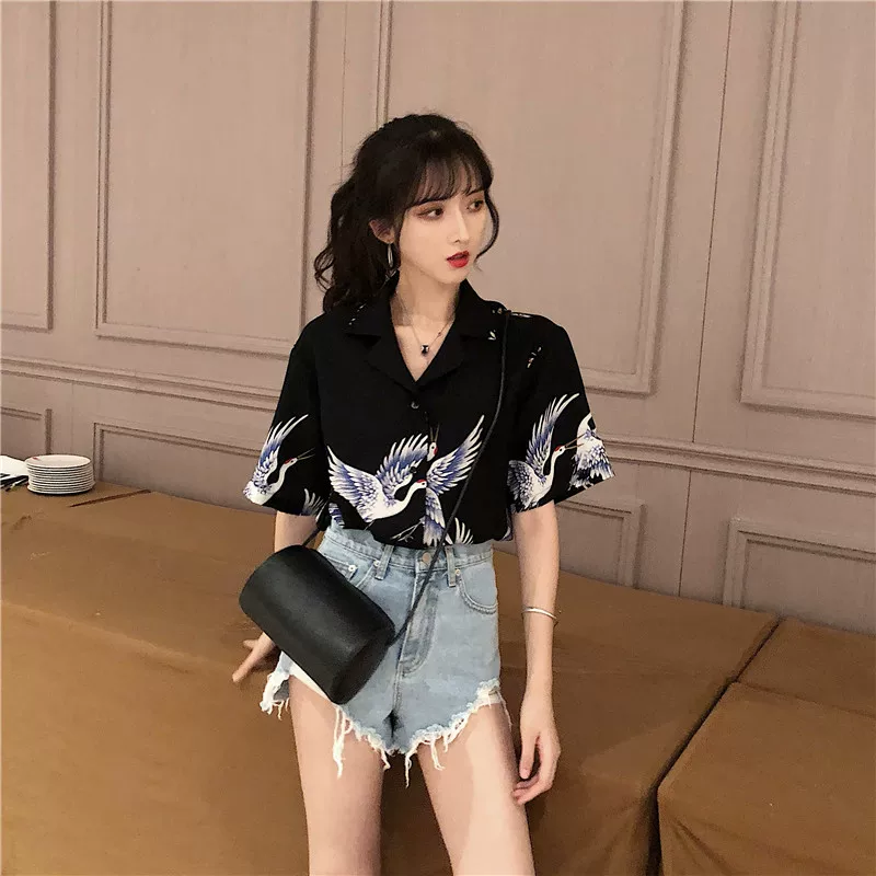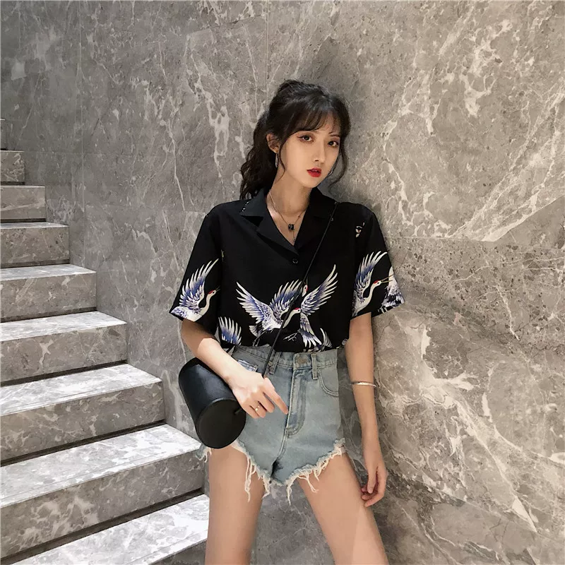 Рубашка женская с принтом журавля, винтажная Свободная Повседневная рубашка в стиле улззанг, в стиле панк, Харадзюку