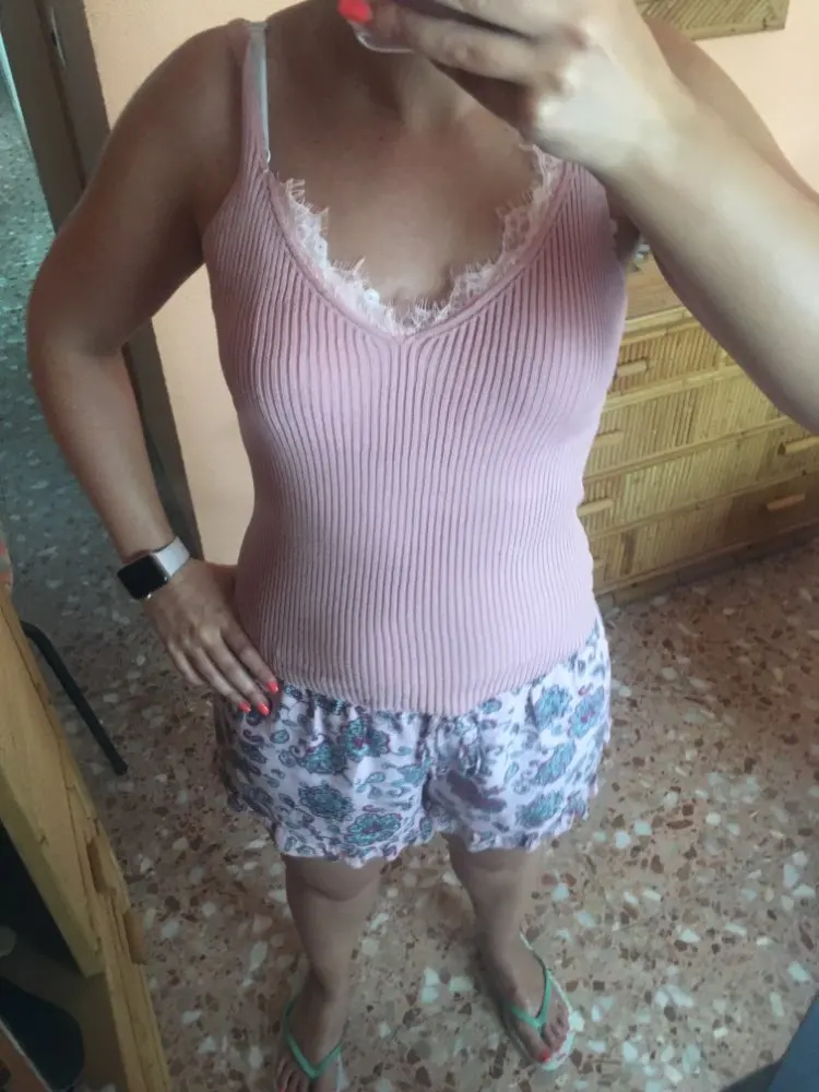 Доставка была быстрой в Испанию, около 10 дней. Это стоит нескольких измерений, потому что ткань сильно тянется. Какая действительно короткая. Я не ставлю ему 5 звезд, потому что он пробежал немного непрошитым вокруг подмышек. Кружево хорошее Цена неплохая.