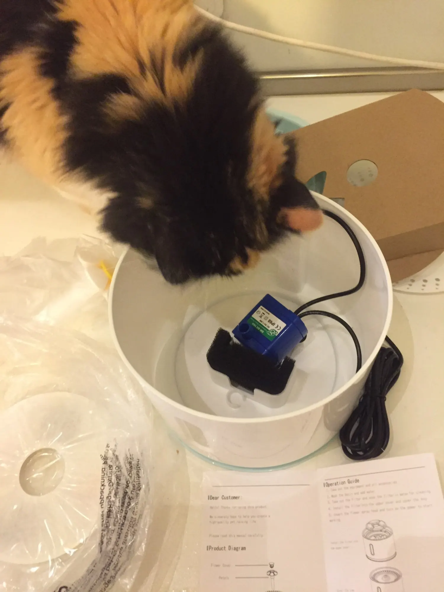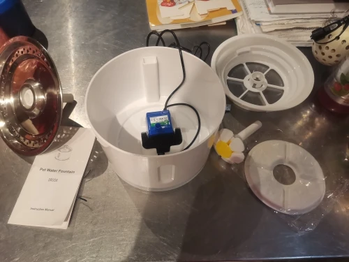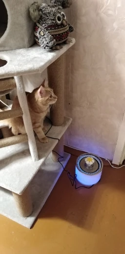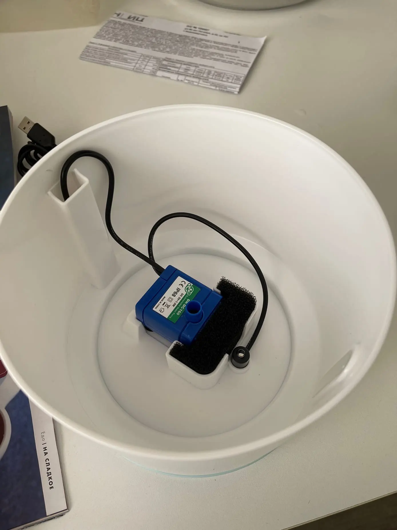 Кот пока странно поглядывает, но надеюсь, что оценит все же с так все как нарисовано, достаточно тихий фонтанчик. слышно конечно как вода булькает, но не критично, моторчик не слышно совсем