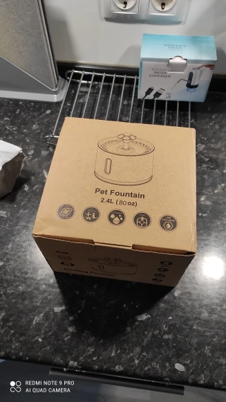 Пришла поилка очень быстро, привёз курьер! Все отлично работает, есть звук, но очень тихий, надо прислушиватся, не мешает. Выглядит прилично. В коробке с инструкцией. Реально помещается больше. 2 л воды.