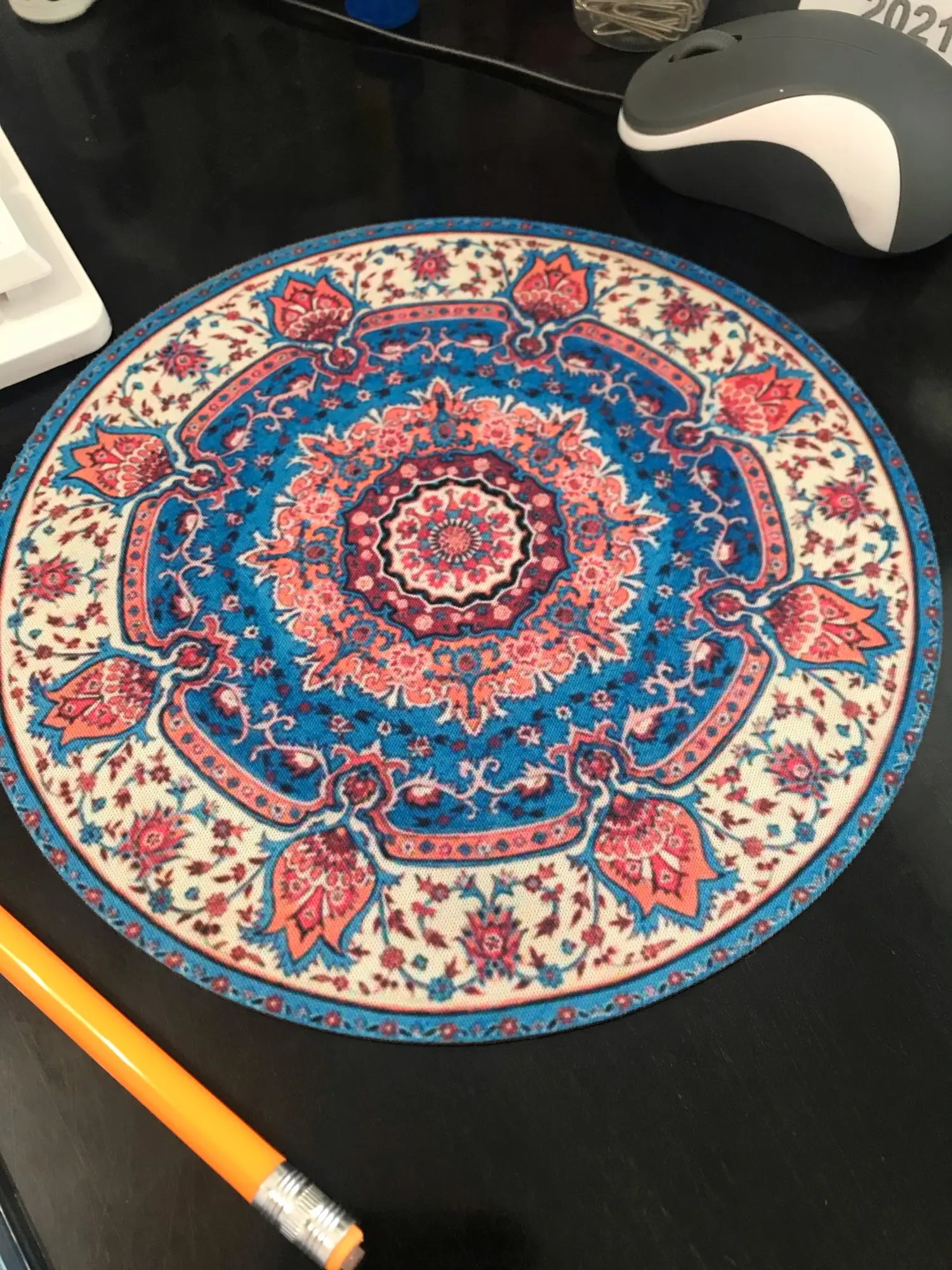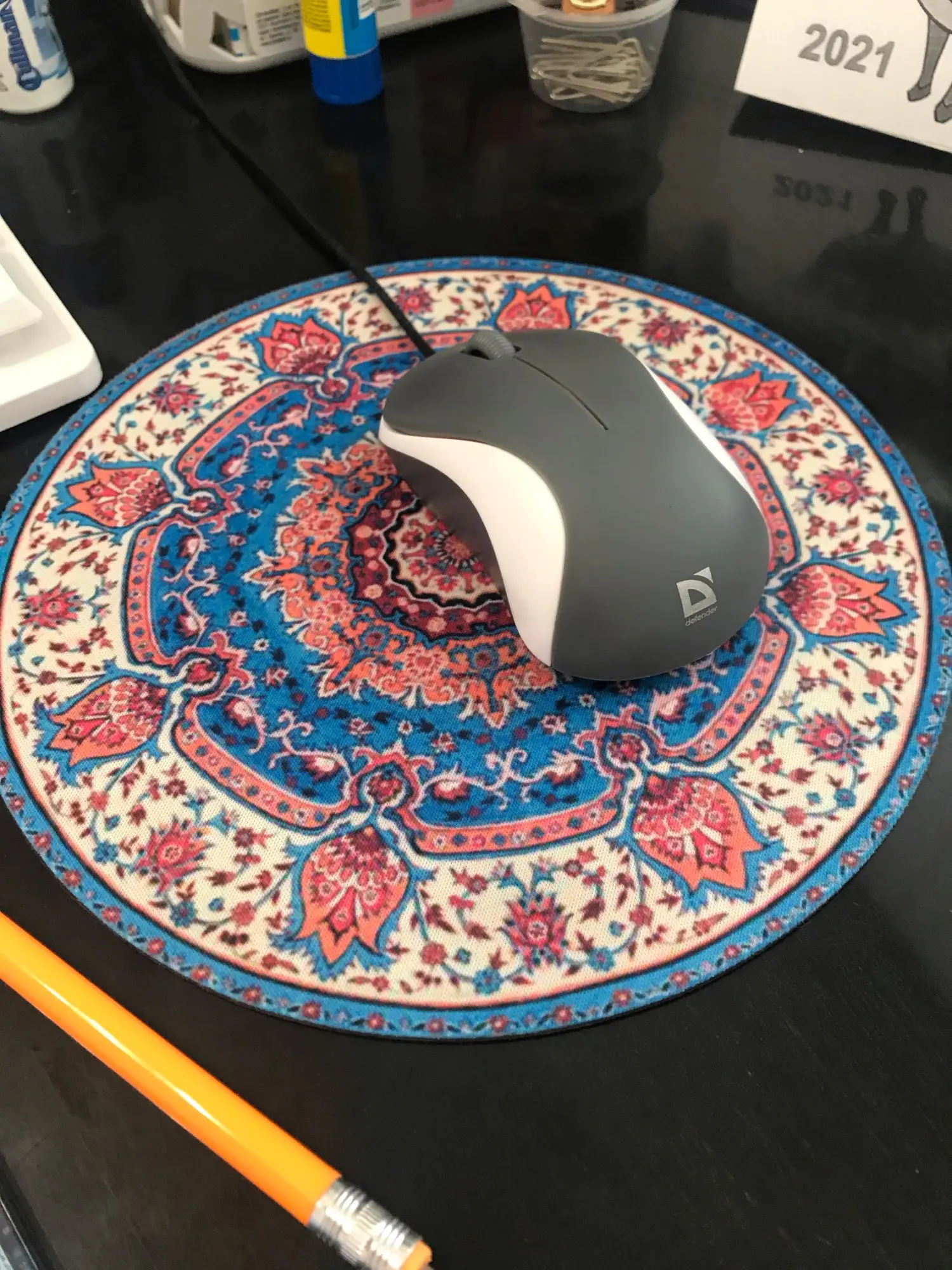 Коврик отличный. Мышка скользит по нему мягко. Выбрал круглый фасон, т.к. прямоугольный размер не эстетичен - края загибаются и неудобно становится ковриком пользоваться. Доставка в Кемеровскую обл. - 79 дней.
