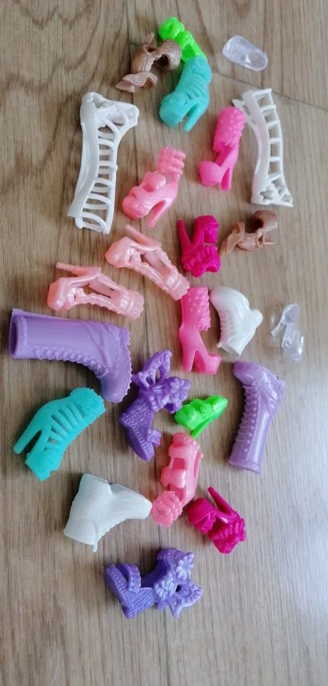шла обувь около месяца. ожидания оправдались более чем! думала, что если 2-3 пары будут нормалтными, уже хорошо. Но хорошими оказались все пары!!! Имейте в виду ВСЯ ОБУВЬ ДЛЯ НОГИ "ПОД КАБЛУК" и сапоги и ботинки тоже!!!!!! По цвету........... цвета не совсем такие как на фото продавца. но мне не существенно. По качеству............. Проработка элементов вроде хорошая, но сравнивать мне особо не с чем. Наплывов, заусенцев, недостатка пластика почти нет. если не придираться- то очень даже хорошо. По размеру....... Вот тут немного расстроилась. Брала для Барби "безграничные движения" ( йога) со стандартным телом. Стопа у неё на шарнире, тоесть должна подходить обувь и с каблуком и без. Ей обувь подошла не вся прозрачные туфельки и розовые на фото сними малы совсем. ( прозрачные мелкие, из разреза розовых вся пятка торчит) Для барби с ного "под каблук" должно подойти. зелёные и коричневые ( копия монстр хай) маловаты. впихнуть ногу можно, но некрасиво. в зелёных шарнир страшненько см