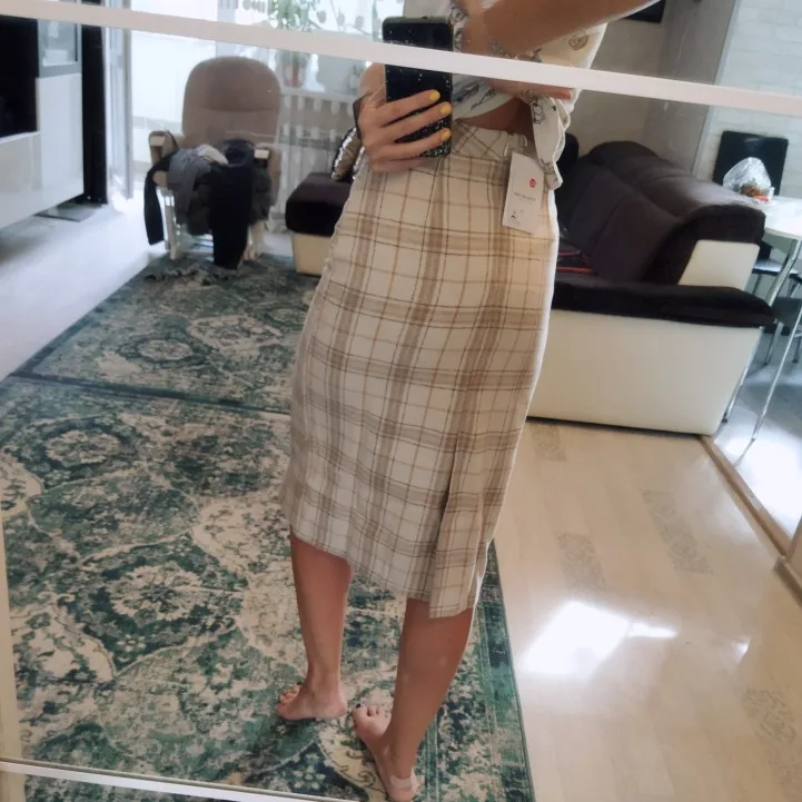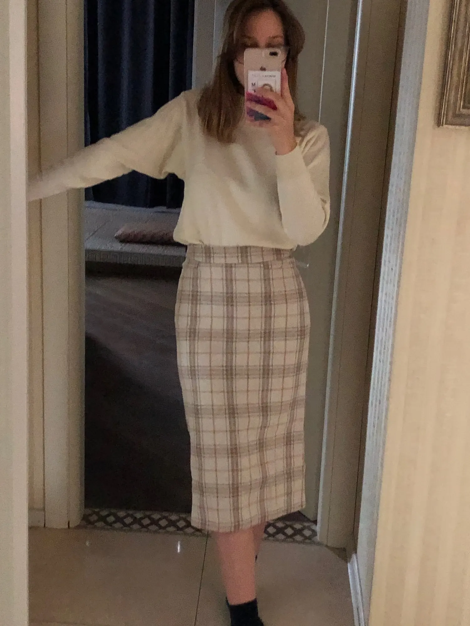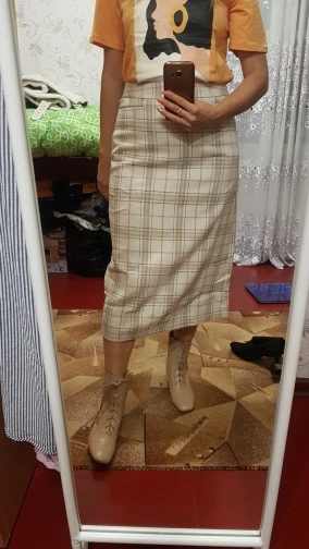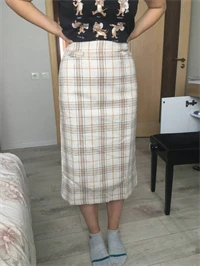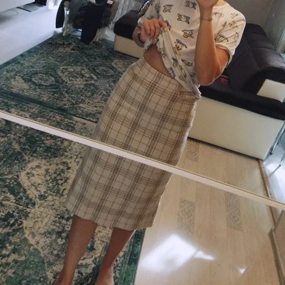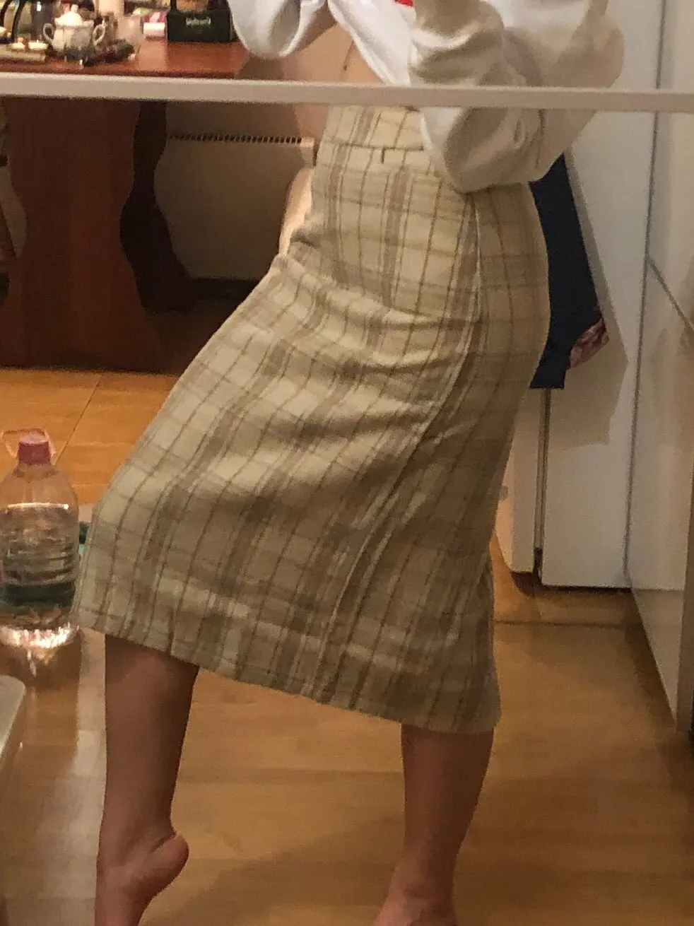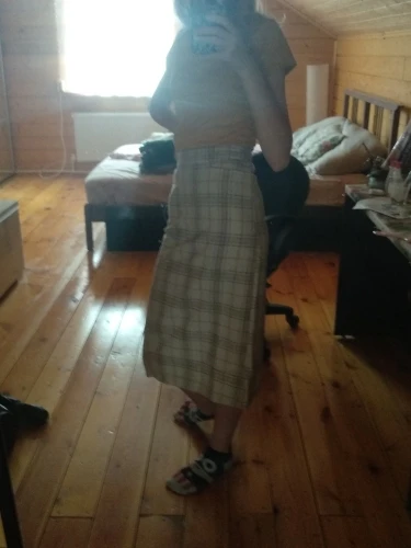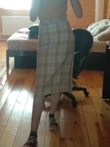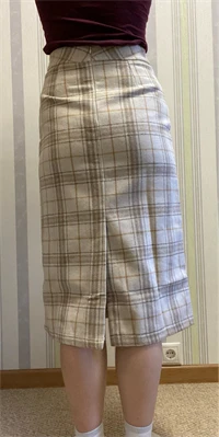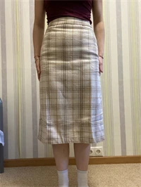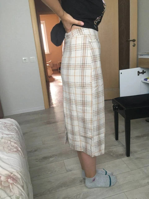 Юбка хорошо села на 46 размер, на швах клеточки ровно стыкуются, ткань хорошая, пошито аккуратно, рекомендую