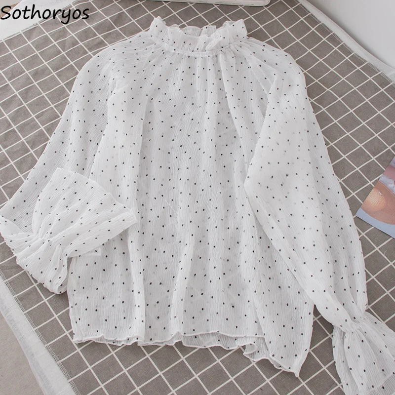 Рубашка женская шифоновая однотонная, с высоким воротником и расклешенными рукавами