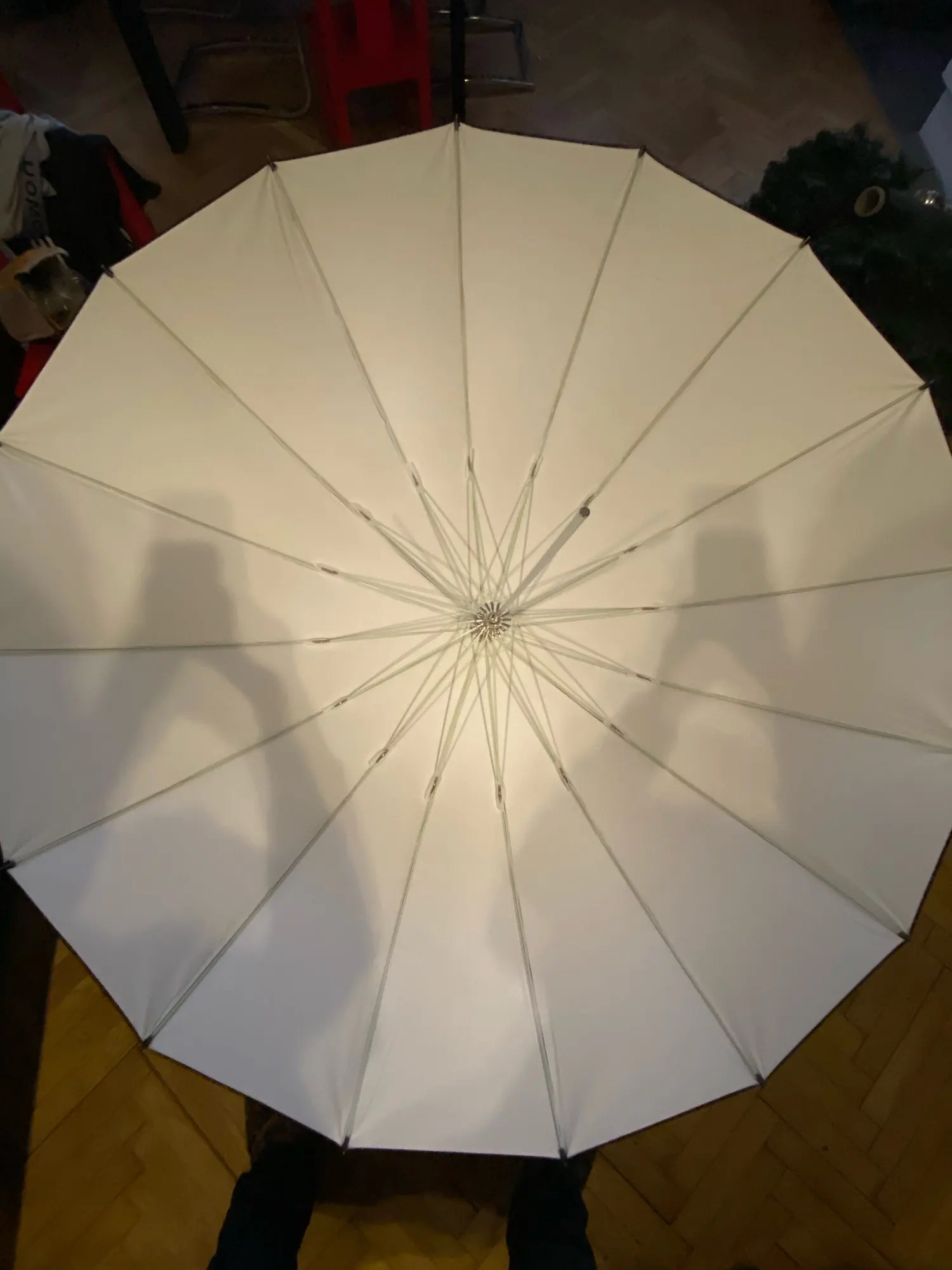 Все отлично. Зонтом довольна. Рассеиватель из шуршащего материала, но я вроде уже привыкла.