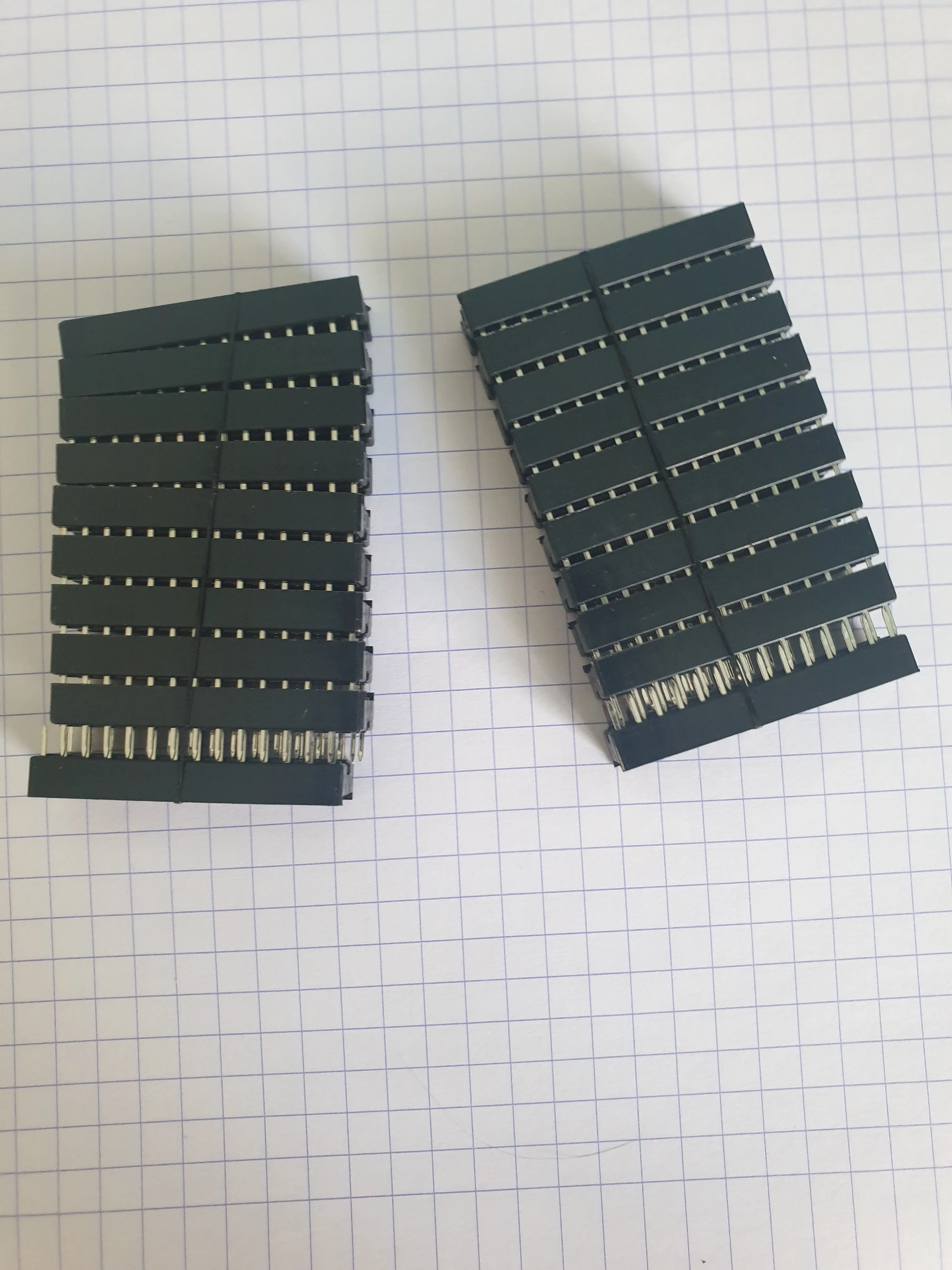 FYI: контакты, которые поставляются с микроконтроллером, слишком большие для этих (и большинства) розеток, но я знаю, что когда я их купил. Вместо этого следует использовать ножки из диодов или резисторов. Квадратное отверстие может соответствовать стандартным контактам.