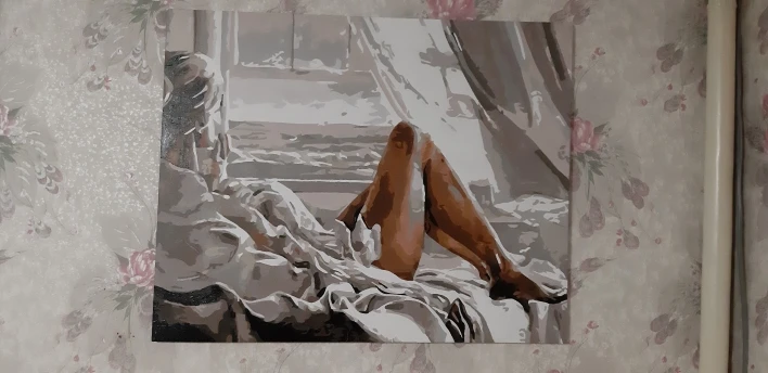 Мне всегда нравится делать краску по номерам, но она выглядит по-разному. Без окна и все волны розовые и трудно увидеть голову и волосы девушки, также Ноги совершенно разные цвета и так же занавески