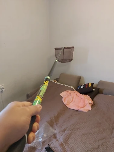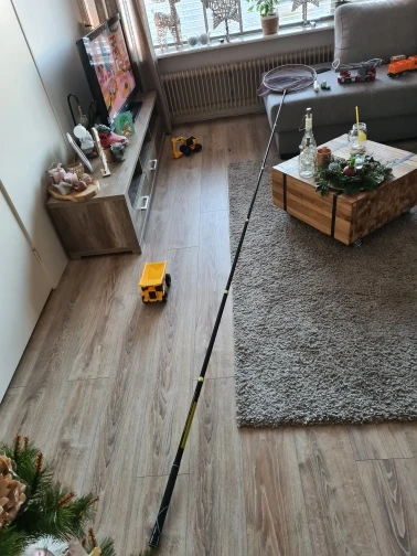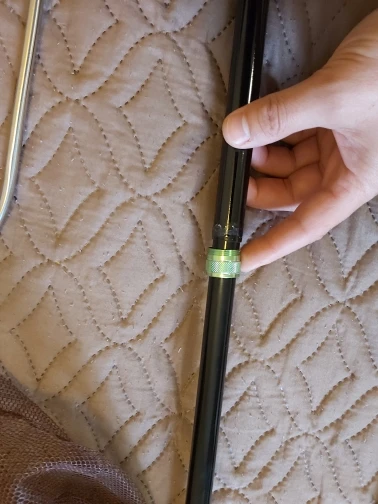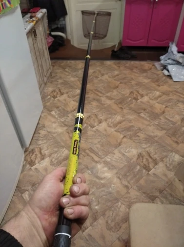 Доставка 14 дней. Тонкая лёгкая и крепкая. Одной рукой держать легко. Даже за самый конец. Сетка, от этого же продавца подошла идеально. Длинна ручки 3,80см. Этапы можно скручивать. Таким образом, можно уменьшать длинну, если полная длинна не нужна.