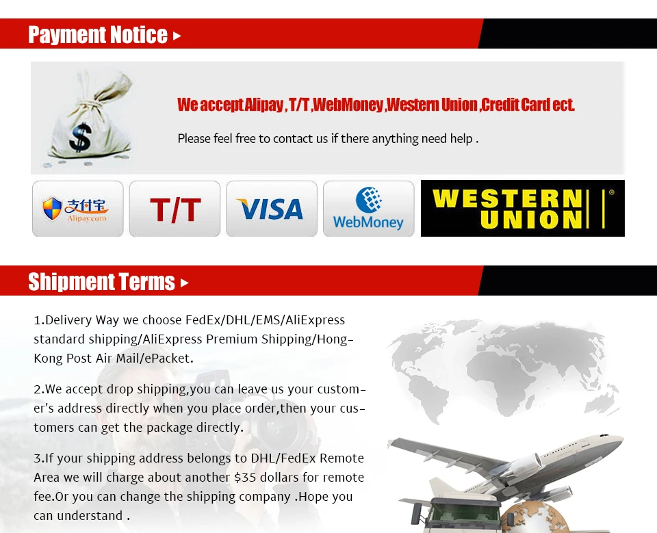 Мы принимаем Alipay , T/T ,WebMoney ,Western Union, кредитные карты и т. Д.