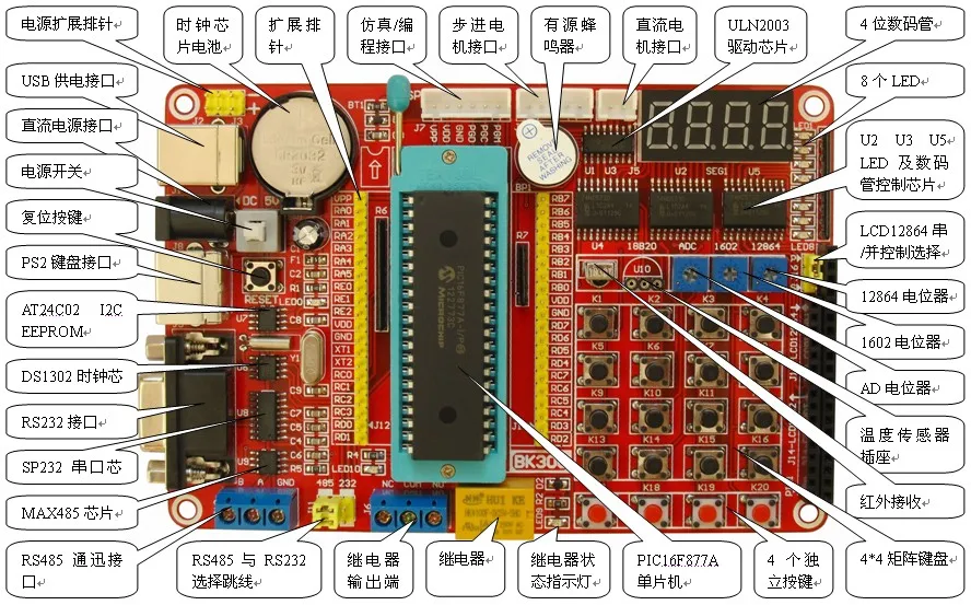 _ BK300 PIC development в дополнение к плате уже содержит множество периферийных цепей, булавки микропроцессоров с одним чипом могут быть четко маркированы через пин-массивы. Пользователи могут свободно расширить периферийные цепи DuPont Line для достижения различных экспериментов.