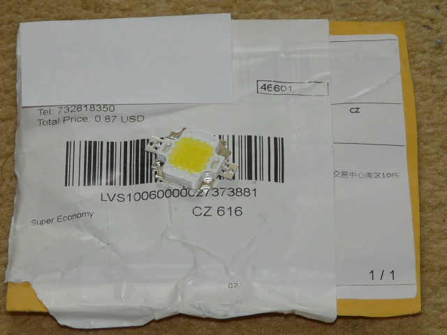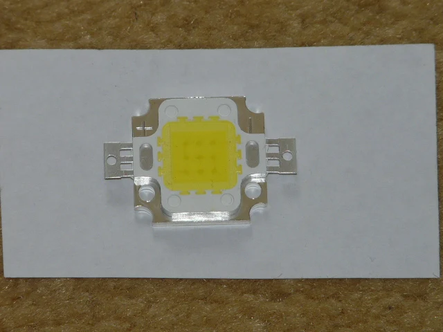 Я заказал 5 шт. Яркость светодиодных чипов не является абсолютно одинаковой, как вы можете видеть на фотографиях. Но это не слишком плохо. Согласно описанию Максимальная мощность составляет 100 Вт, но я думаю, что это не рекомендуется. Более 1 Ампер яркость всего лишь слегка увеличивается. При 1 Ампер напряжение составляет около 26 вольт. Вы не увидите разницы между 2 и 3 А. Таким образом, да, вы можете запускать его на 100 Вт (3 а), но это не стоит того, более 60 Вт (2 а) яркость не будет увеличиваться только нагревом. Лучшая эффективность (яркость/Ватт) составляет около 500 миллиампер (около 12 ватт).