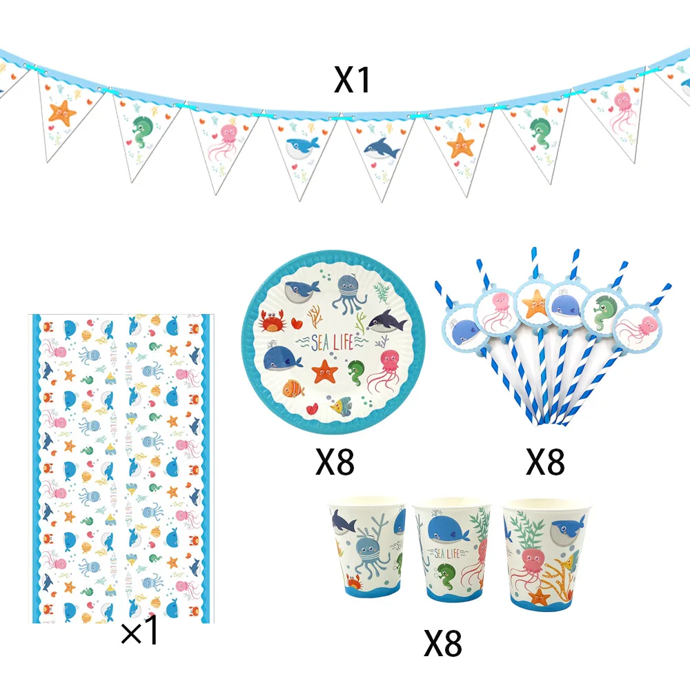 26 шт. для 8 детей морские животные тематические праздничные товары для дня рождения набор посуды, тарелка + солома + чашка + тарелка + баннер