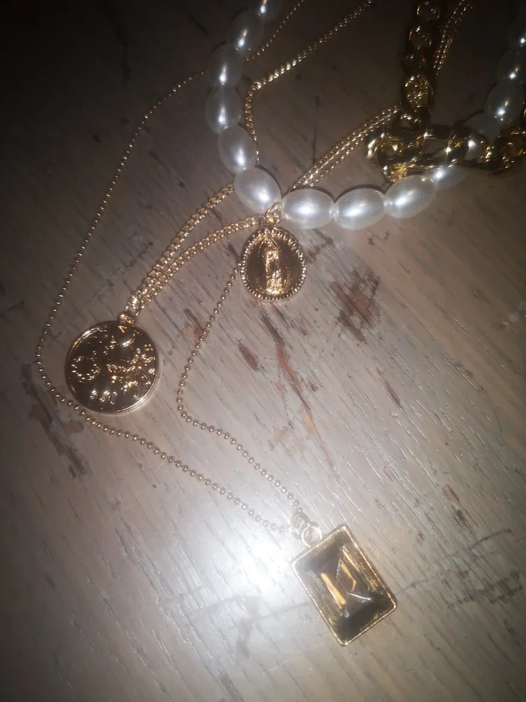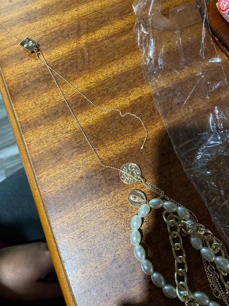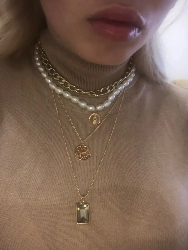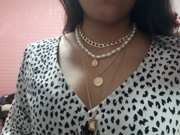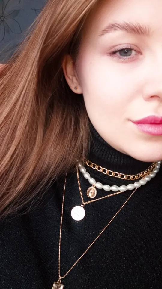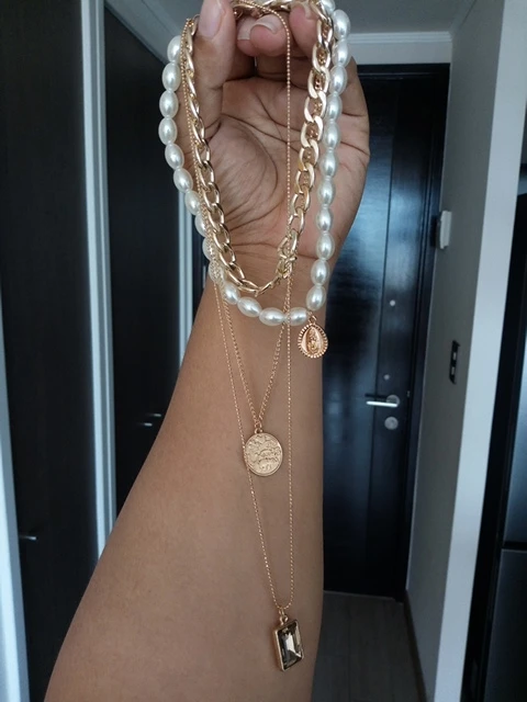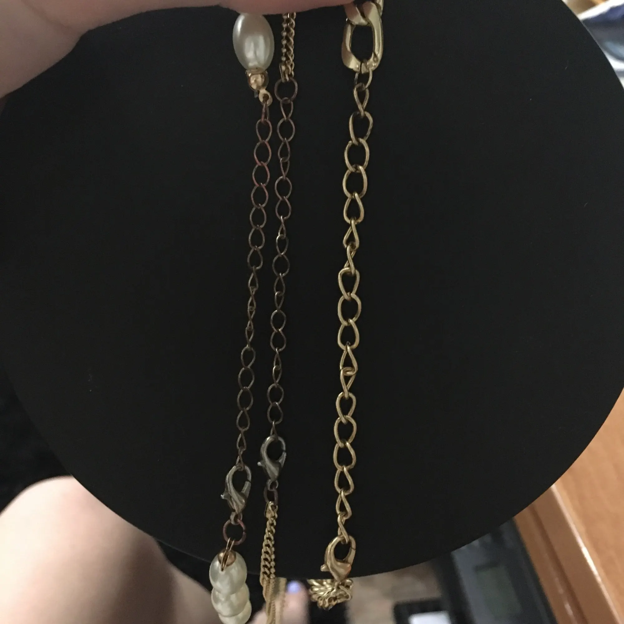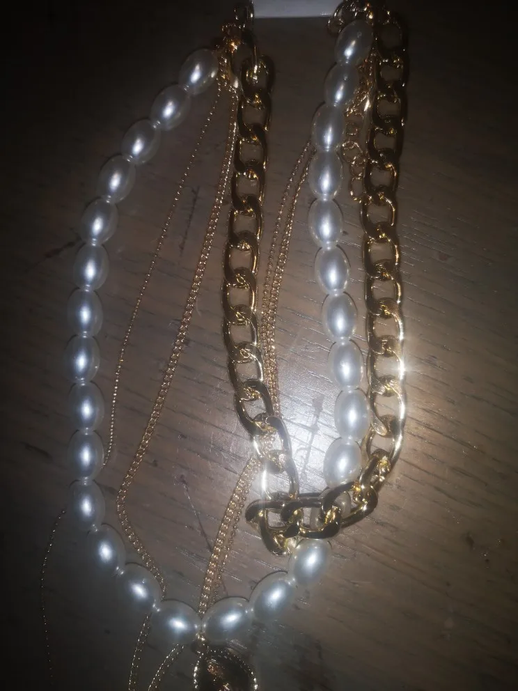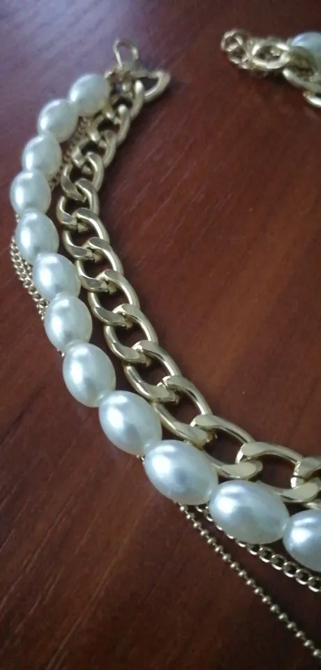 красивое колье, жемчужину, конечно, пластиковые, но не смотрятся дёшево. маленькая цепочка регулируется, можно носить как чокер или ослабить, чтобы не душила. длинная цепочка без застёжки, регулируется при помощи колечка туже-слабже. универсальное украшение, можно носить вместе, по отдельности или комбинировать с другими цепями и колье. я очень довольна