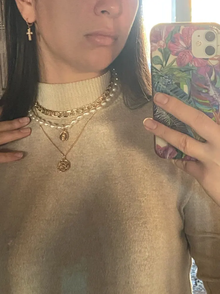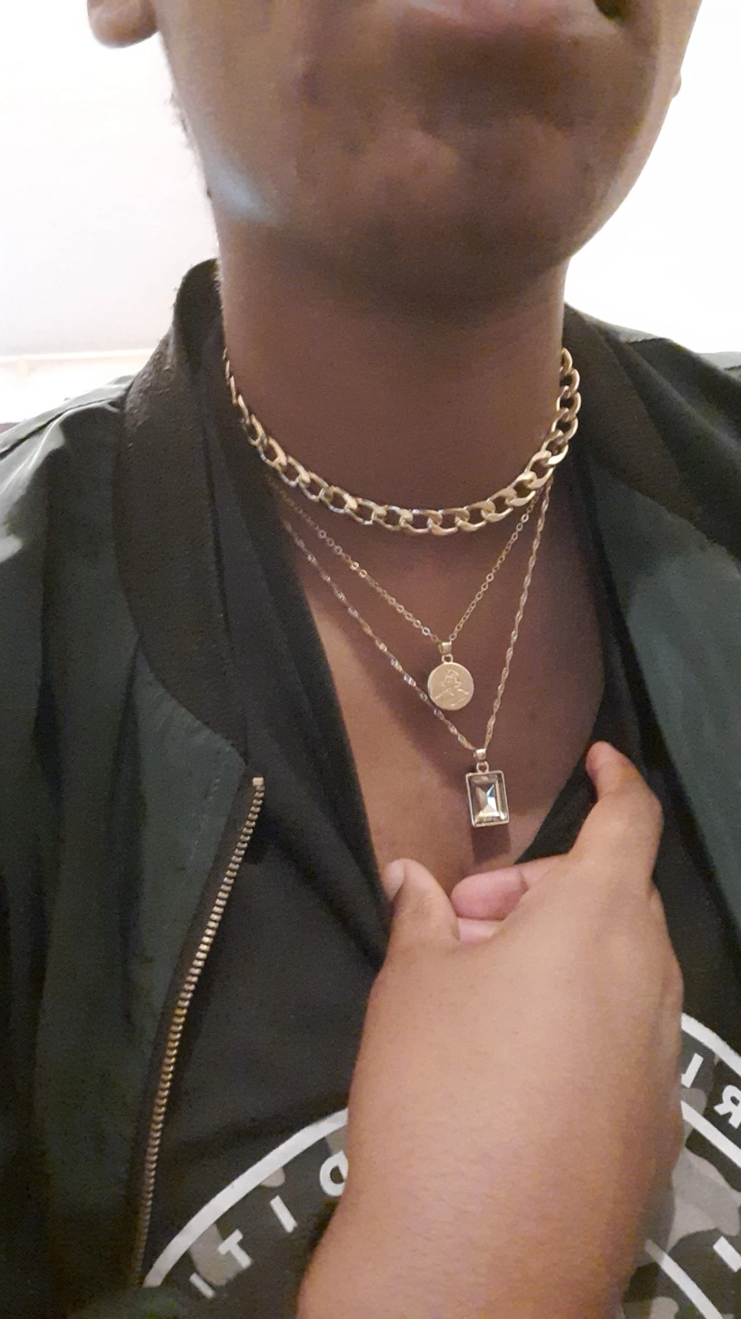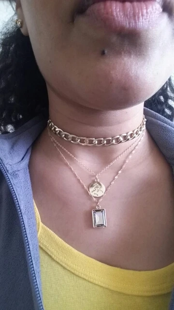 Красивое украшение. Интересно смотрится и на водолазке, и непосредственно на коже. У меня контактная аллергия, боялась, что проявится на коже. Но нет, даже от целого дня ношения. Для себя я отсоединилась самую короткую цепочку, мне так нравится больше. Но и с ней красиво