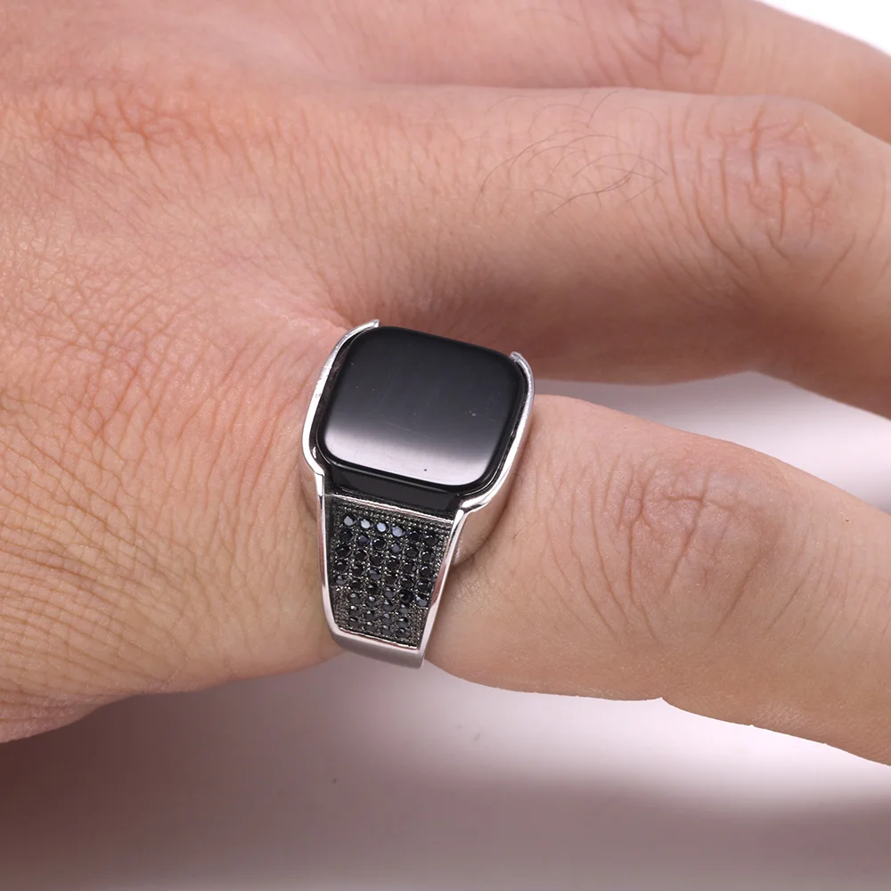 Гарантированно 925 пробы серебряные кольца античные турецкие кольца ювелирные изделия для мужчин с квадратными черными натуральными камнями простой дизайн