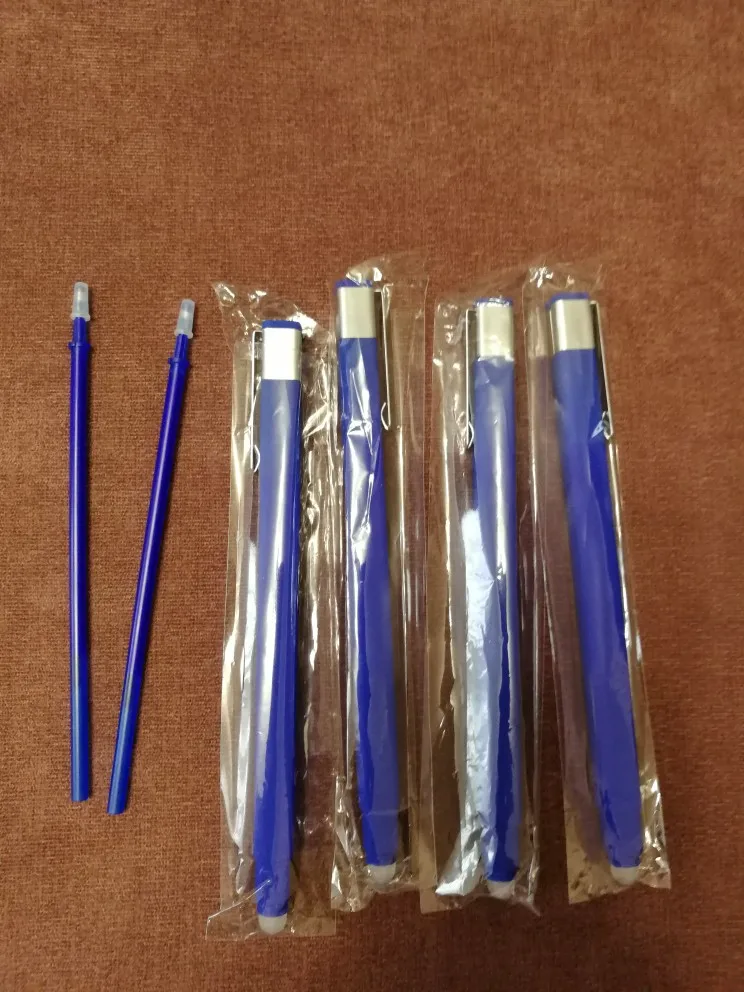 Заказываем у этого продавца уже 5-й раз, у них синие ручки с синими чернилами, а другие скрывают и нам присылали в описании синие, а чернила черные, которые по факту серые. Приятный нескатывающийся корпус и не видно ластик под колпачком, с виду как обычная ручка.