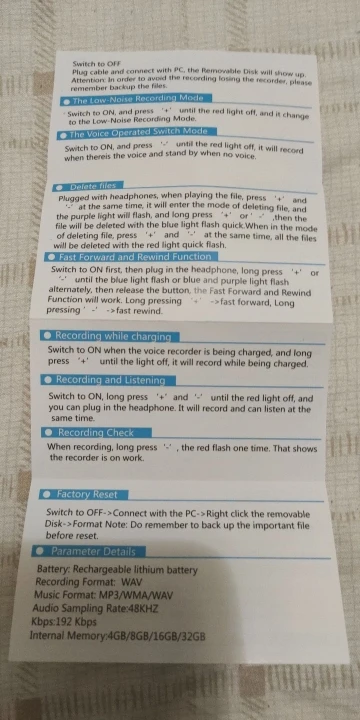 Устройство пришло быстро. Заказывал на 16 Гб. Продавец общительный. Если вы форматируете устройство, то продавец вам вышлет ссылку на Гугл диск. (Устройство работает и после форматирования . Просто некорректно отображается время/дата записи. Это можно исправить в файле через ПК) Тестировал устройство. Оставлял на запись чуть более 4 часов. Весь промежуток был записан. Слышно в соседней комнате. Также можно использовать как флешку само устройство. Устройство просто в управлении и имеет 3 режима управления с ним. Первый- это когда вы передвигаете ползунок в положение "on". Тогда идёт запись аудио на устройство. Второй- это когда вы через usb вход выходите на ПК. В этот момент идёт заряд устройства, а вы можете просмотреть всё информацию на устройстве. Третий- это когда вы подключаете наушники к устройству. Тогда вы можете прослушивать определенные форматы на устройстве. В целом устройством доволен. Спасибо продавцу.