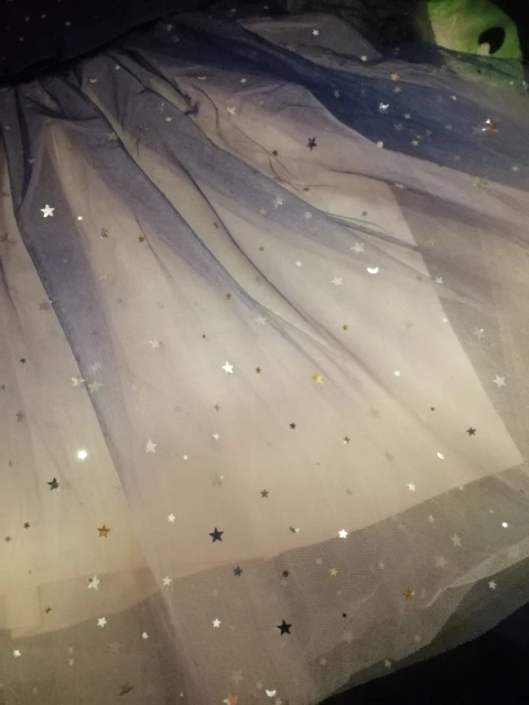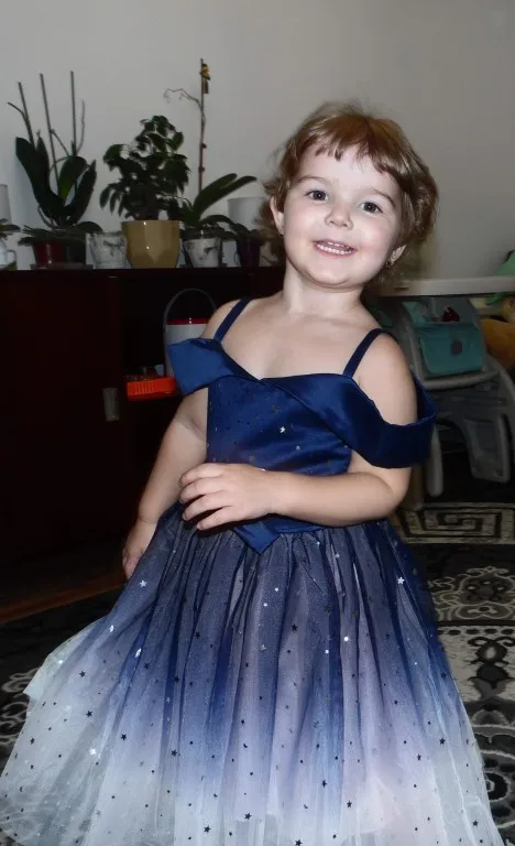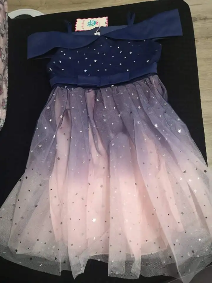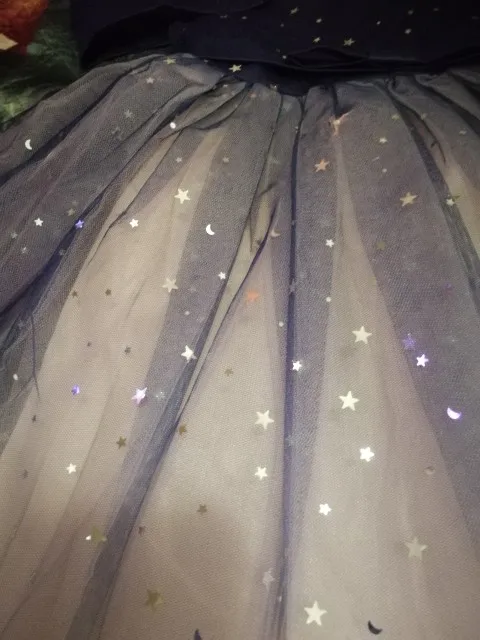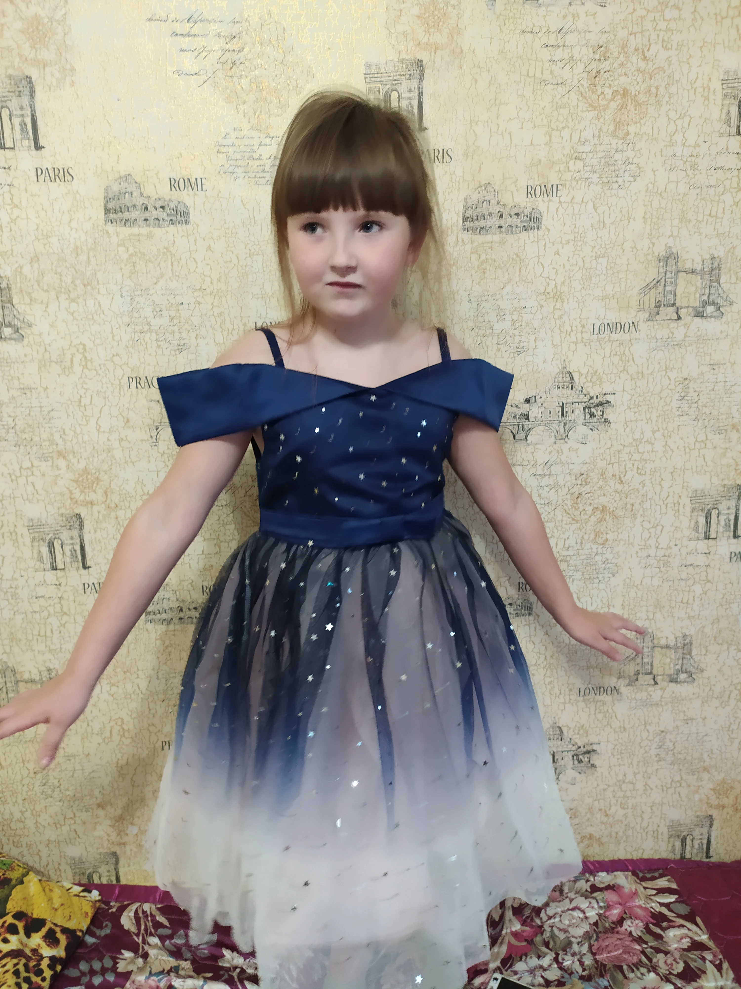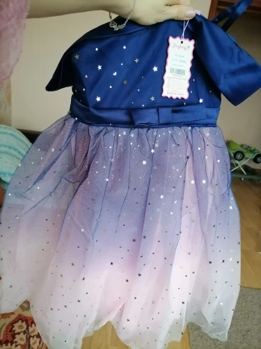 платье красивое, на рост 98 см брали 4т юбка достаточно пышная, подьюпник из мягкой ткани и 3 слоя Фатина. НО звёздочки приклеены Так что стирка только ручная ... швы всё ровные, нитки не торчат . дочке понравилось, Я довольна.