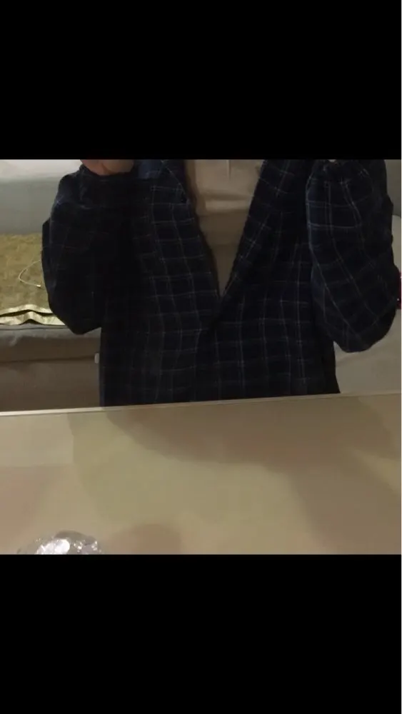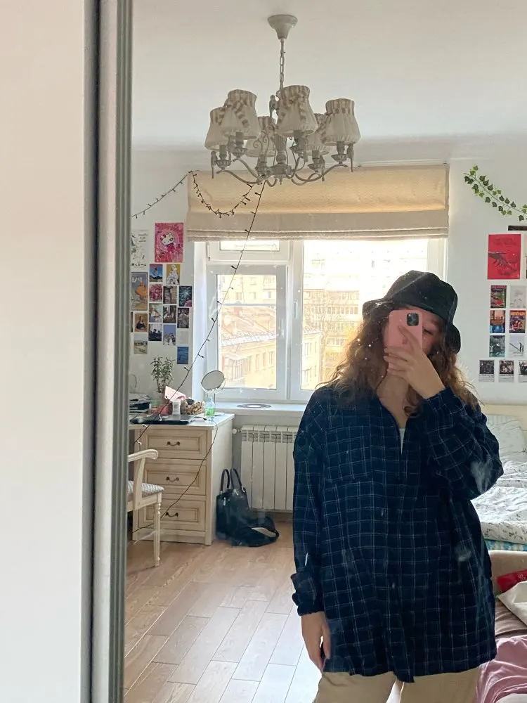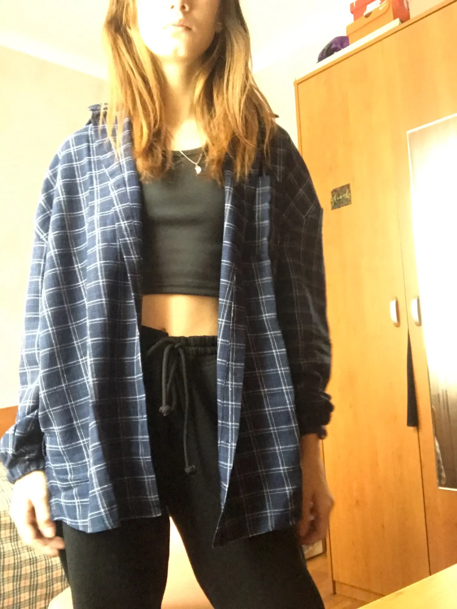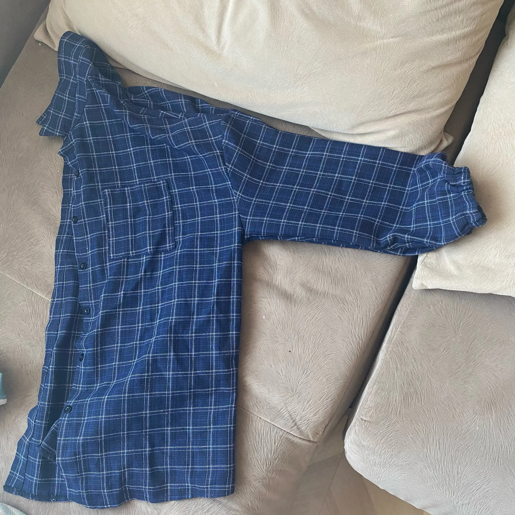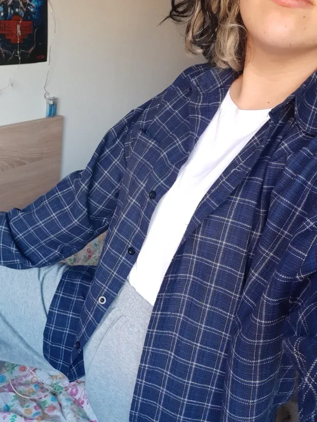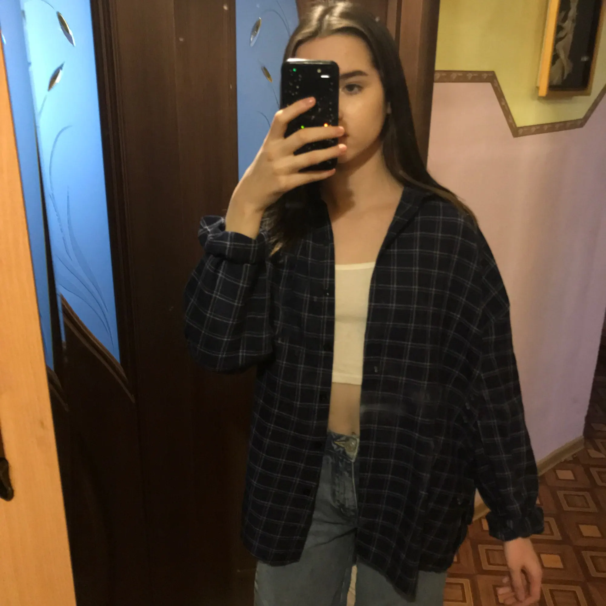она более голубая в жизни и клетка чуть-чуть отличается, немного похожа в ней на уборщицу, но одноклассники сказали норм вроде, оверсайз прям огромная и приятная, что хорошо, рукава немного шире к ладоням и это мило, 9/10 ставлю лайк