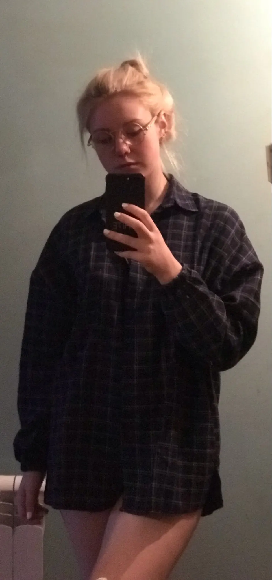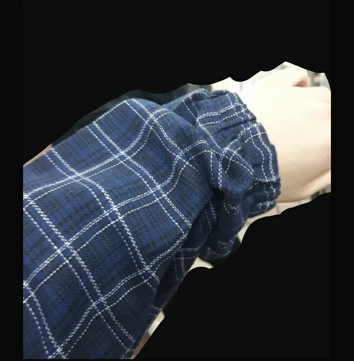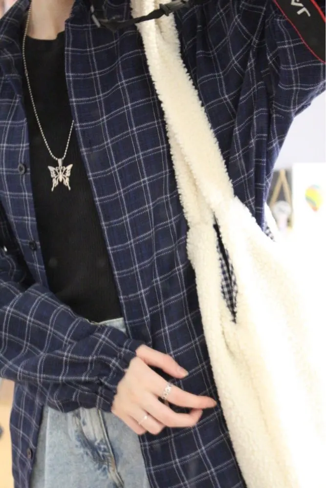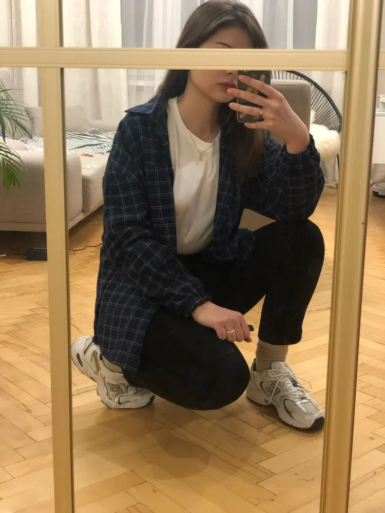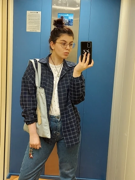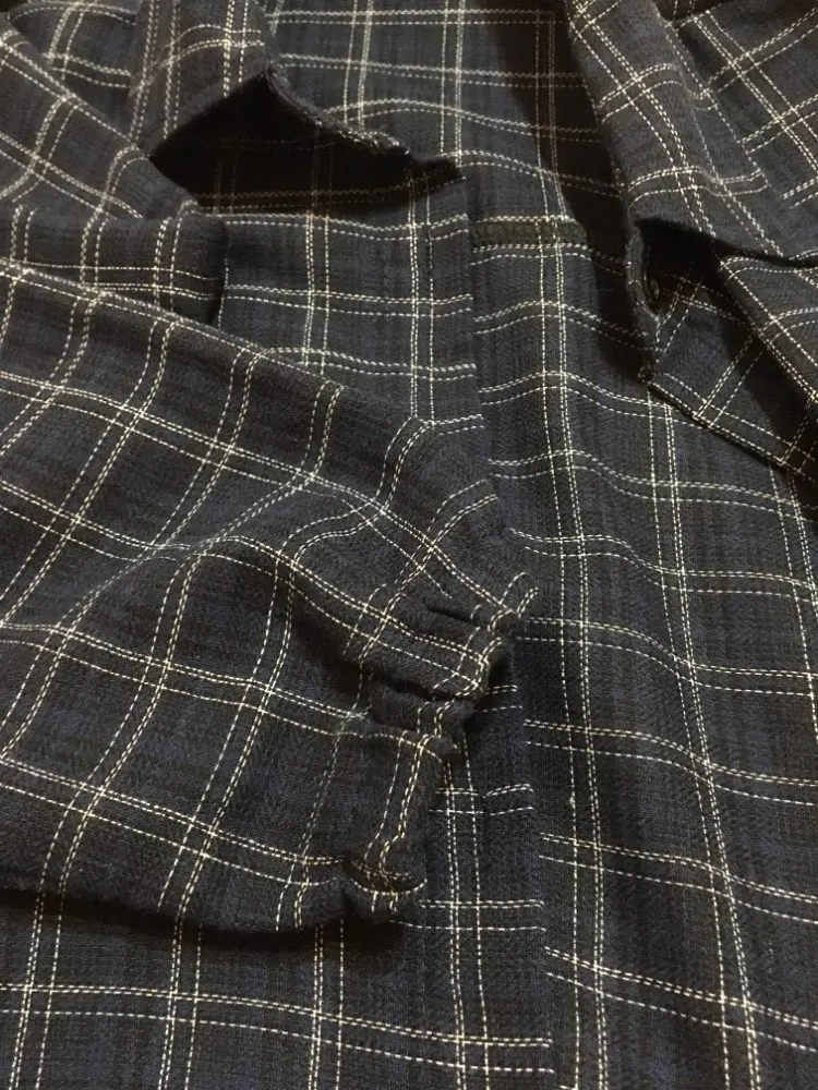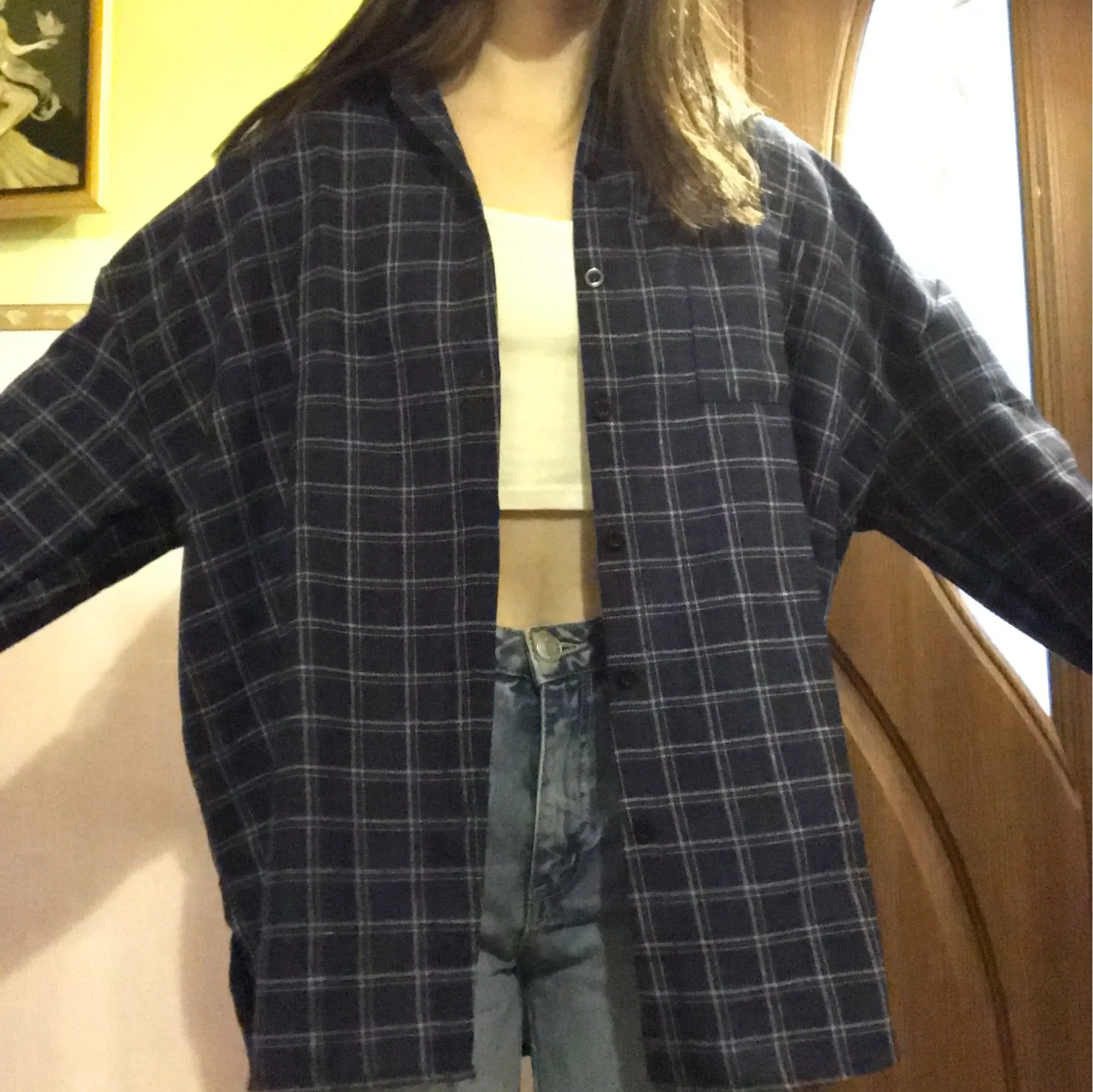 она более голубая в жизни и клетка чуть-чуть отличается, немного похожа в ней на уборщицу, но одноклассники сказали норм вроде, оверсайз прям огромная и приятная, что хорошо, рукава немного шире к ладоням и это мило, 9/10 ставлю лайк