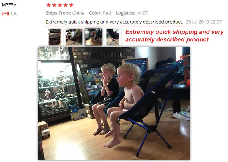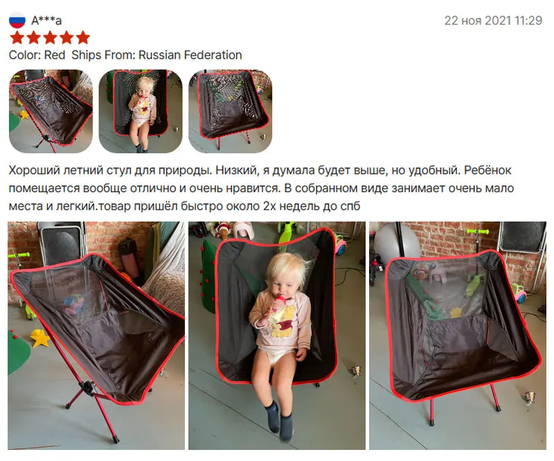 Через 1 день после заказа получила товар. Товар соответствует описаю. Заказали два стула. Красный и синий. Так вот красный лучше качества, чем синий,поэтому я открыла спор и вернули 1/3 часть денег. В красном Прочнее ткань, там даже пропитка какая-то, сетка плотная,поэтому маме я отдала красный, для её 80 кг супер, но она боялась очень садится на него, так как с виду хлюпкий. Он очень тяжело собирается!!! Мы всей семьей (девушки) пыхтели. Рассчитан только для ровной поверхности, не вздумайте ставить на почву, что бы ножки уходили в землю, иначе стул сломается. Мои 50 кг выдерживает на ура. Удобный, жаль подлокотников нет. Он очень лёгкий. Буду брать на прогулку с ребёнком. Но сабирать его оооочень сложно, очень тяжело, вся в натяг, боюсь при неудачном натягивании рано или поздно сломаю (