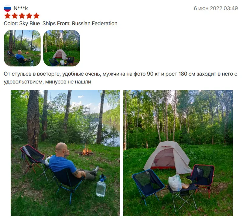 Отличный стул. Сидеть удобно, не проваливаешься глубоко. Выглядит не очень крепким, но 80 кг выдерживает легко. Прошито очень качественно. Собирается легко. Очень компактное в сложенном виде, весит меньше 1 кг. Продавец отправил заказ быстро, но шло 3 недели из рф.