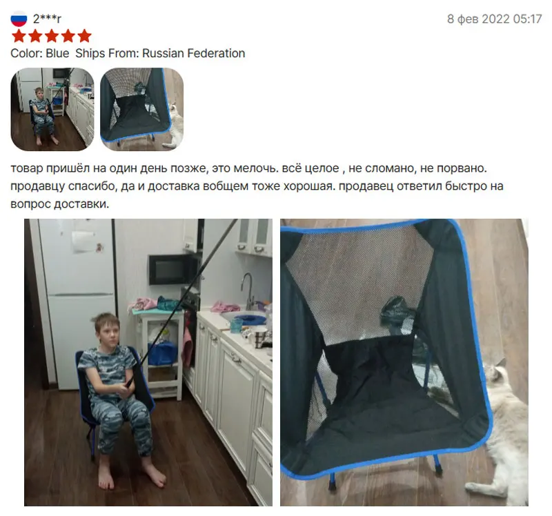 Кресло понравилось, удобное, по ощущениям прочное, легкое, в чехле много места не занимает, собиется быстро. Доставка из РФ, через 2 дня уже доставил курьер (в Санкт-Петербург). У этого продавца было дешевле других, положили брелок в подарок. Покупкой доволен.