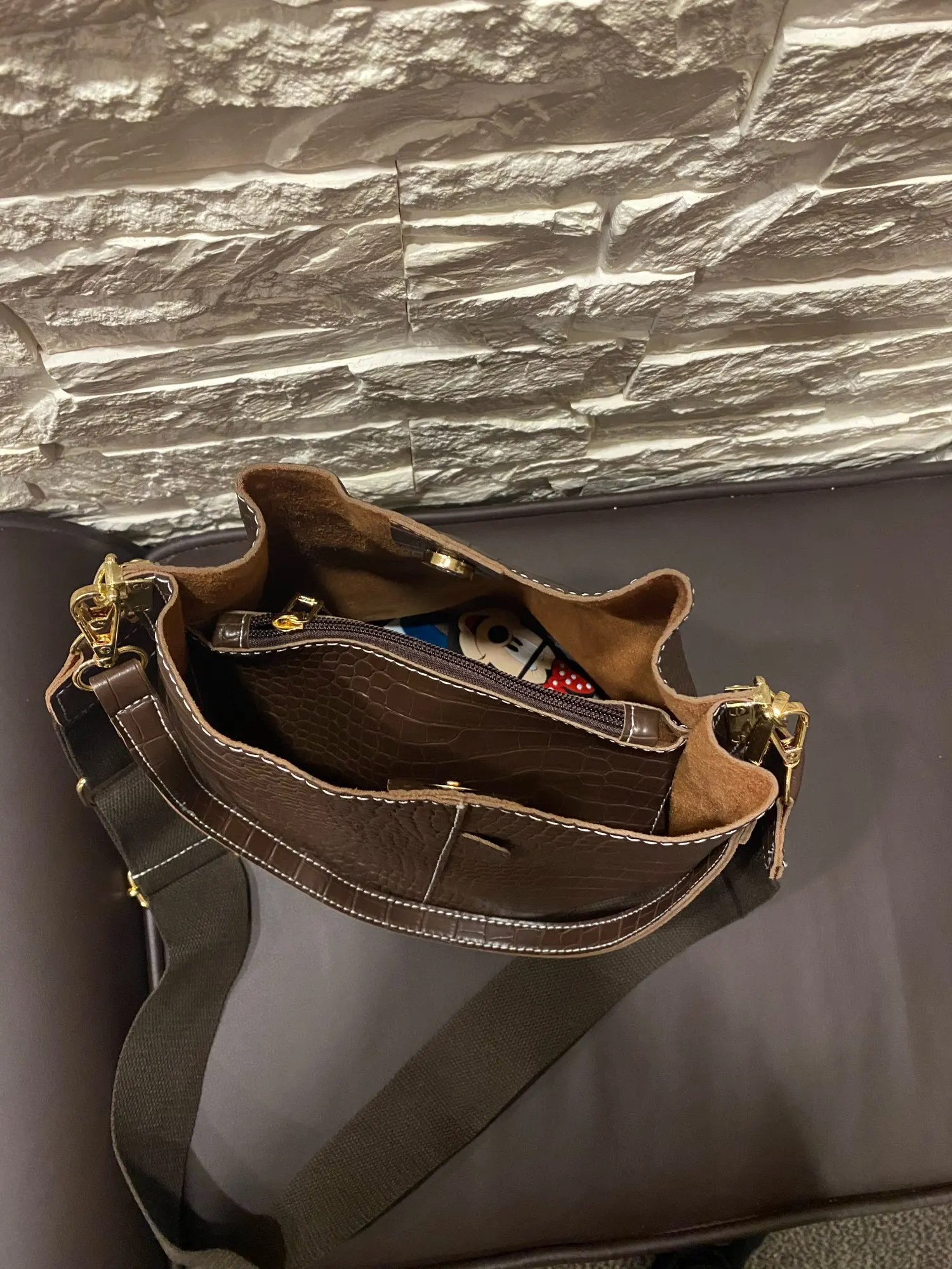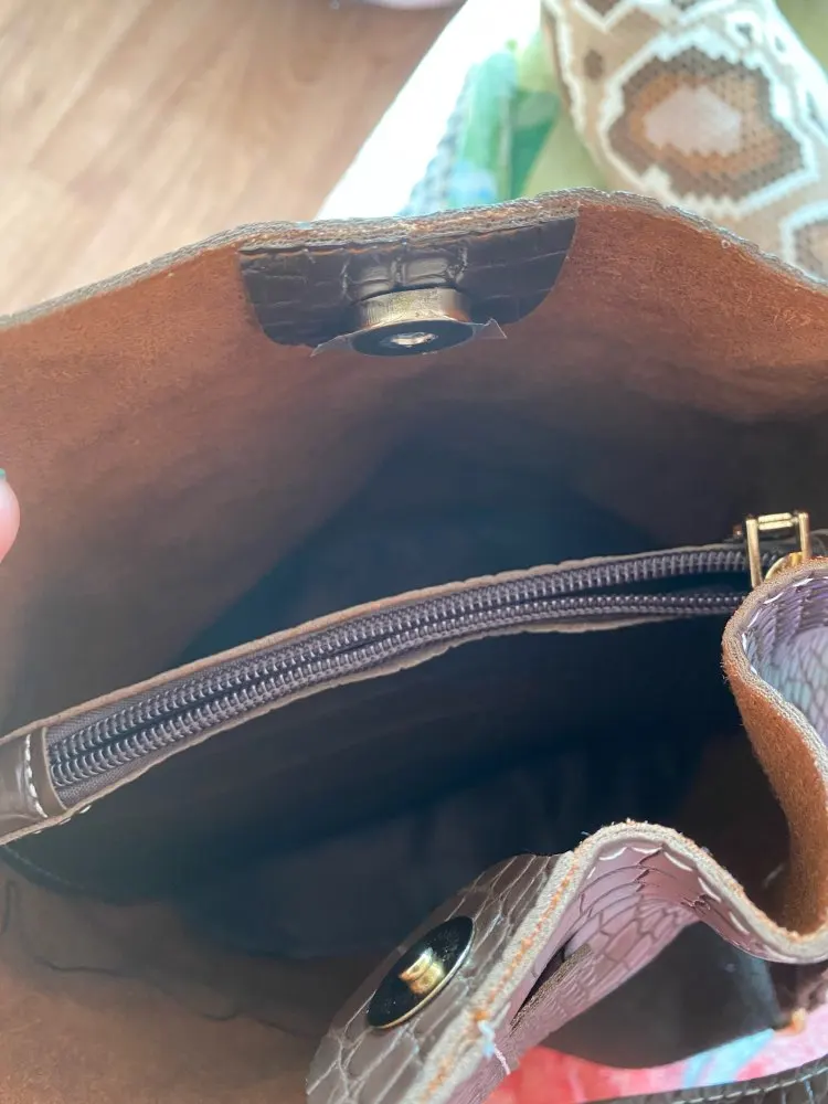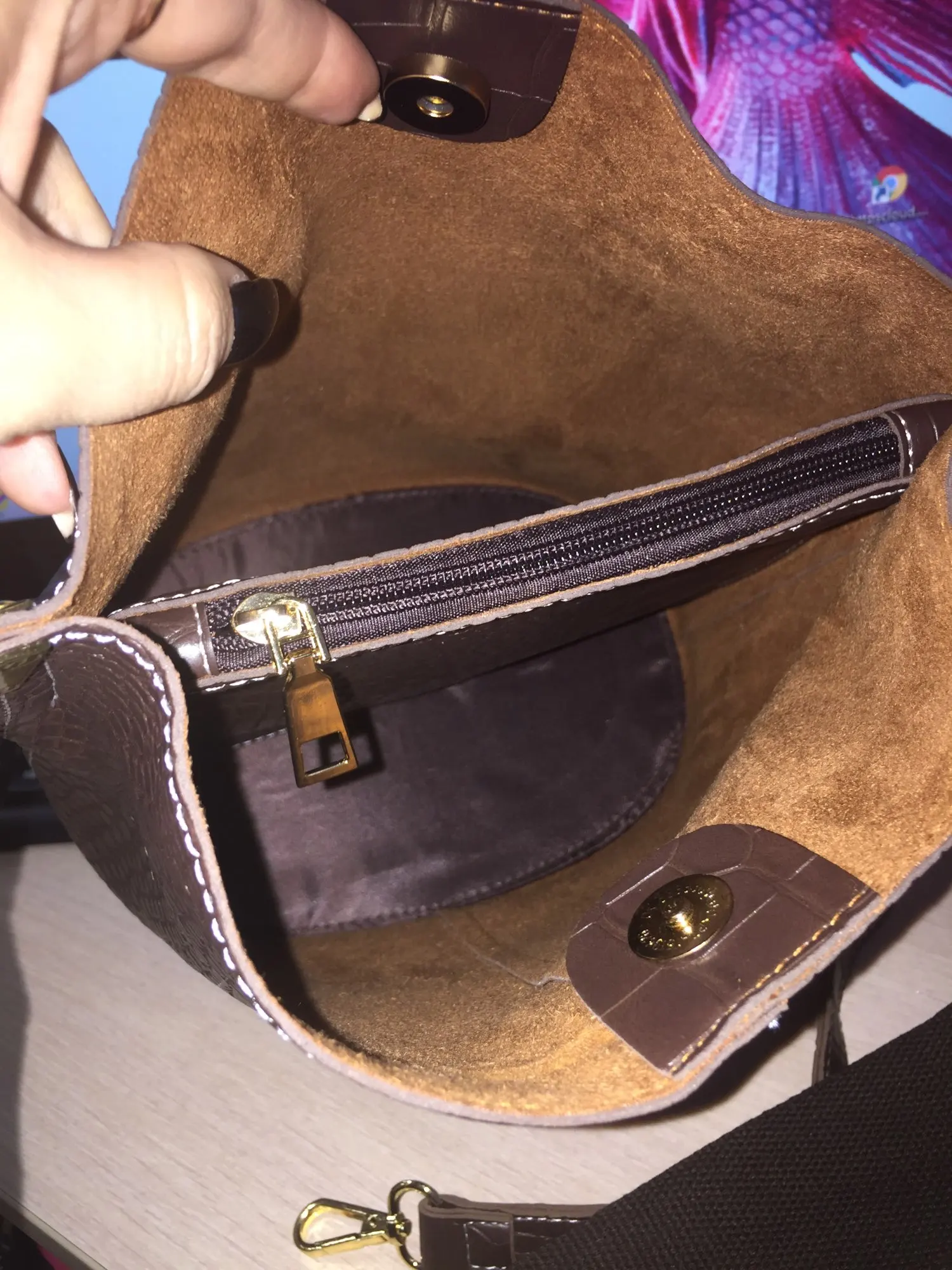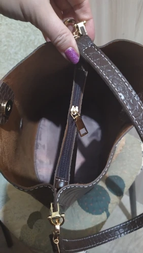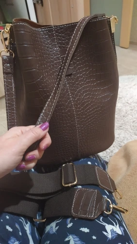 Отличная сумка, цвет - шоколад, ремешки а комплекте, внутренние магниты, как и писали в других отзывах, действительно прешмты не к сумке, а к маленькому кусочку кожи, специально для этого нашитого, скорее всего долго не проживут! Ещё мне показалось, что на фото верх не заужен, а в действительности верх меньше, что не очень удобно. Но в целом я довольна.