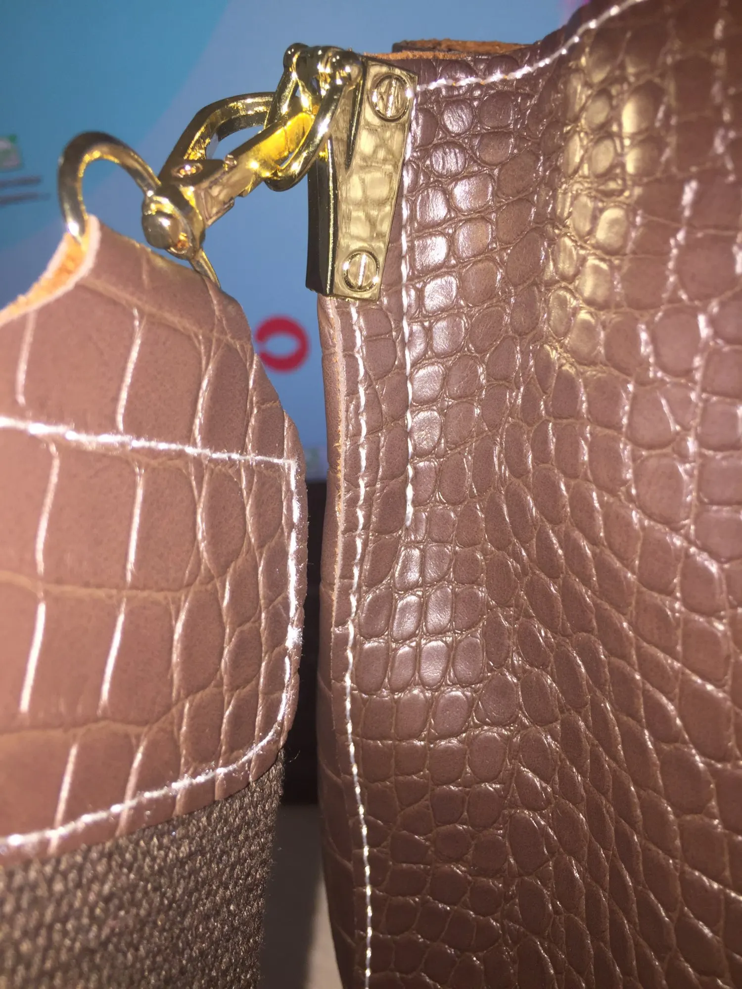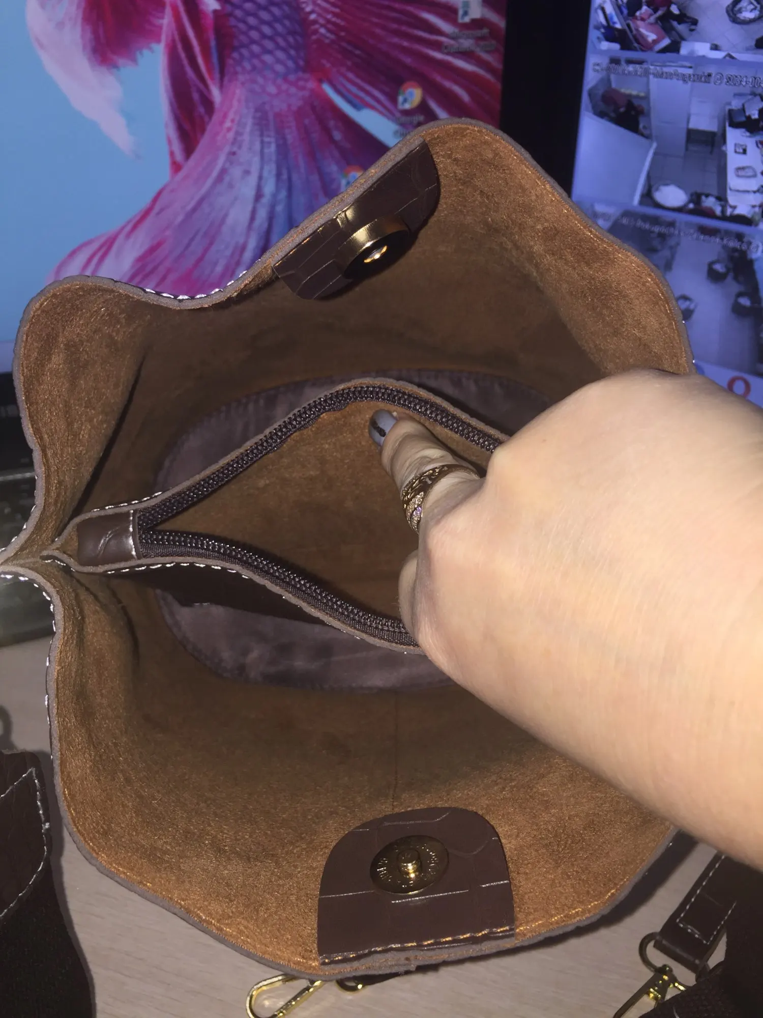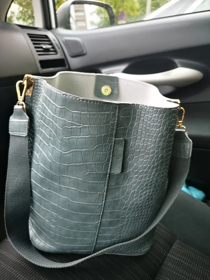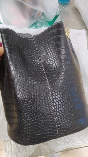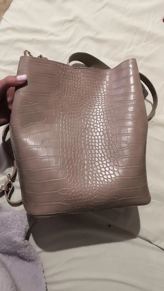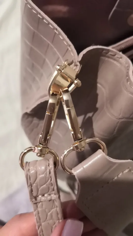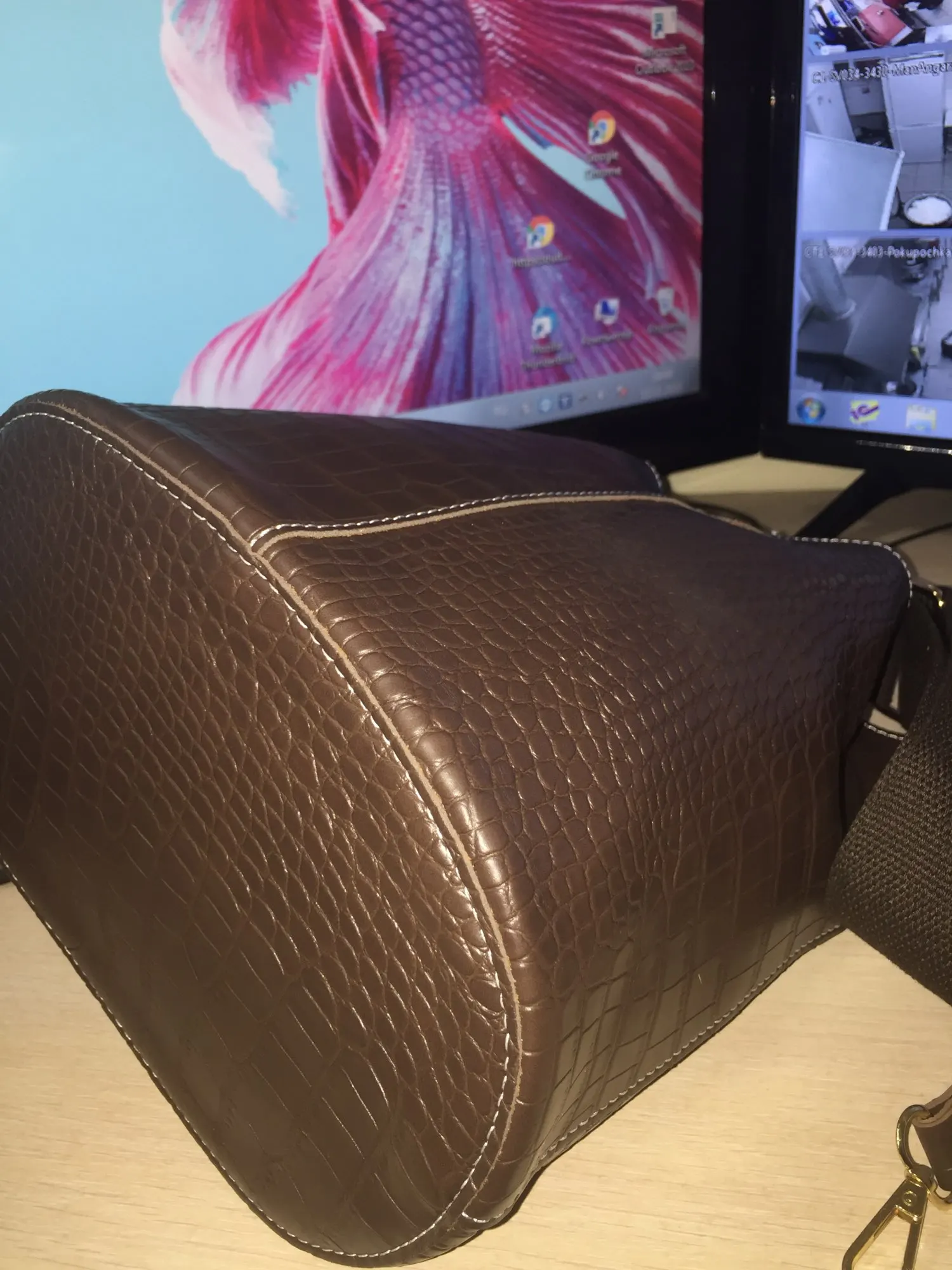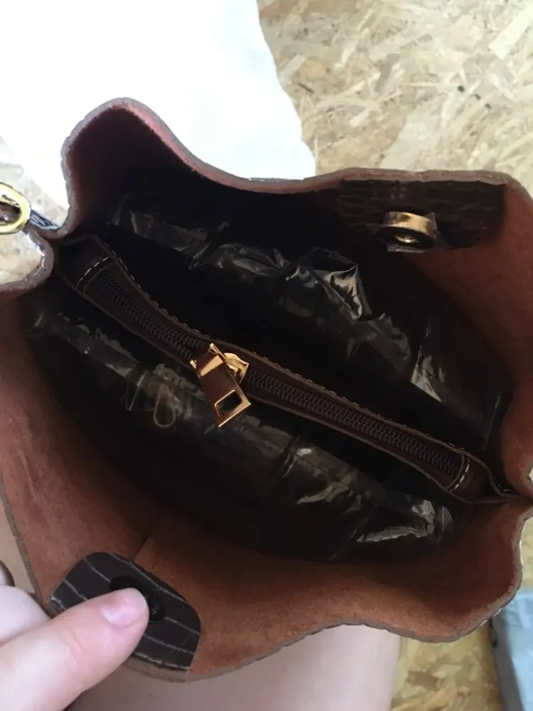 Сумочка симпотичная, полиуретанновый крокодильчик с лёгким запахом. Бежевый цвет с лёгкой ровизной, не жёлто-песочного цвета, приятный на взгляд. Папка фА4не входит, только мягкие журналы и бумаги. Внутренний отдел с молнией вшит в боковые швы сумки, глубокий, внизу не пришит, поэтому можно сместить в сторону (напр. положить контейнер с едой). Магнитная кнопка крепко держит. Кого не смущает всеобщее обозрение содержимого, то вполне все хорошо. Доставка 2недели. Спасибо продавцу за брелок.
