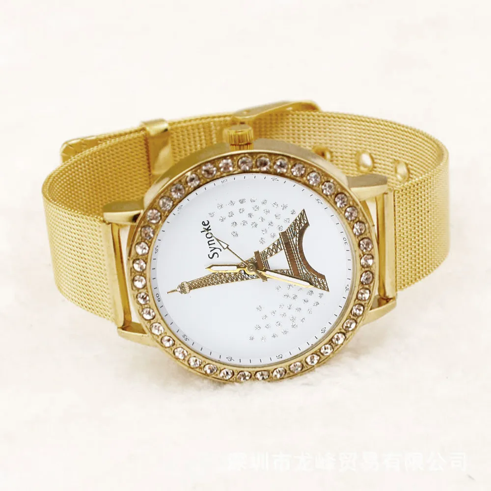 Женские кварцевые наручные часы, женские часы с кристаллами, башней и циферблатом, часы с сетчатым браслетом из нержавеющей стали, новинка, женские часы B50