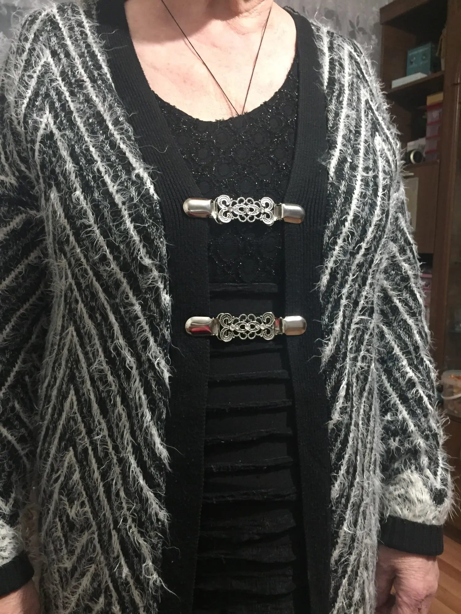 Интересная вещь, клипсы для кардигана мало кто носит, блестит в меру, держит хорошо.. смотрится стильно
