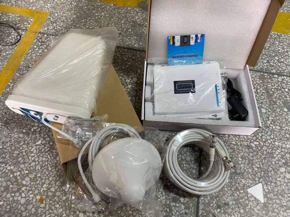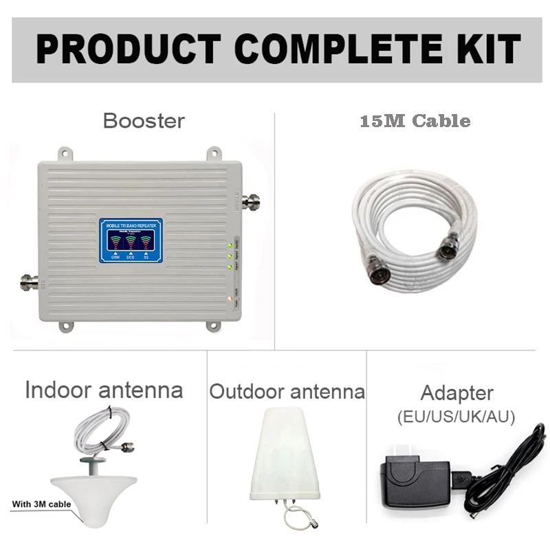 1 шт. повторитель сигнала 900/1800/2100 МГцВнешняя антенна LPDA 1 шт.1 шт потолочный комнатная антенна с кабелем 3 м1 шт 13 м внешний кабель с разъемами1 шт. адаптер1 шт. Руководство пользователя (с китайским, английским, русским и испанским языком 4 вида)