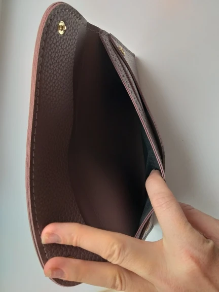 Товар хорошего качества, плотный материал, хорошие швы, крепкие застежки, есть небольшой запах, только цвет ожидала немного другой, более коричневый, в реальности с фиолетовым оттенком, но тоже красивый, вместительный влазит даже телефон самсунг, не обратила внимание, но кармана на молнии нет, если кому то он важен