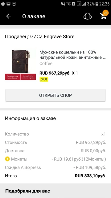 Заказ получил!!! Но правда была маленькая горчинка всё таки!!! Просил продавца сделать надпись на кошельке. Он сделал! Но неправильно написал!!! Повнимательнее надо быть конечно!! Но через спор вернул часть денег!!! Поэтому оценку снижать не буду!!! Товар качественный!!! Доставка тоже быстрая!!! Продавца рекомендую!!! Магазин хороший!!!!