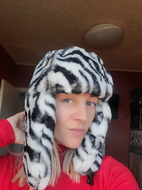 шапка бомбическая, похожа на кекс "Зебра". было немного ниток и помялась немного, но в целом ок. главное,что не воняла. на ОГ 57 см нормасно. можно уши наверх застегнуть, тогда прям soviet style будет. брала за 527 рэ, доставка в постамат.рекомендую эту многофункциональную шапулю.
